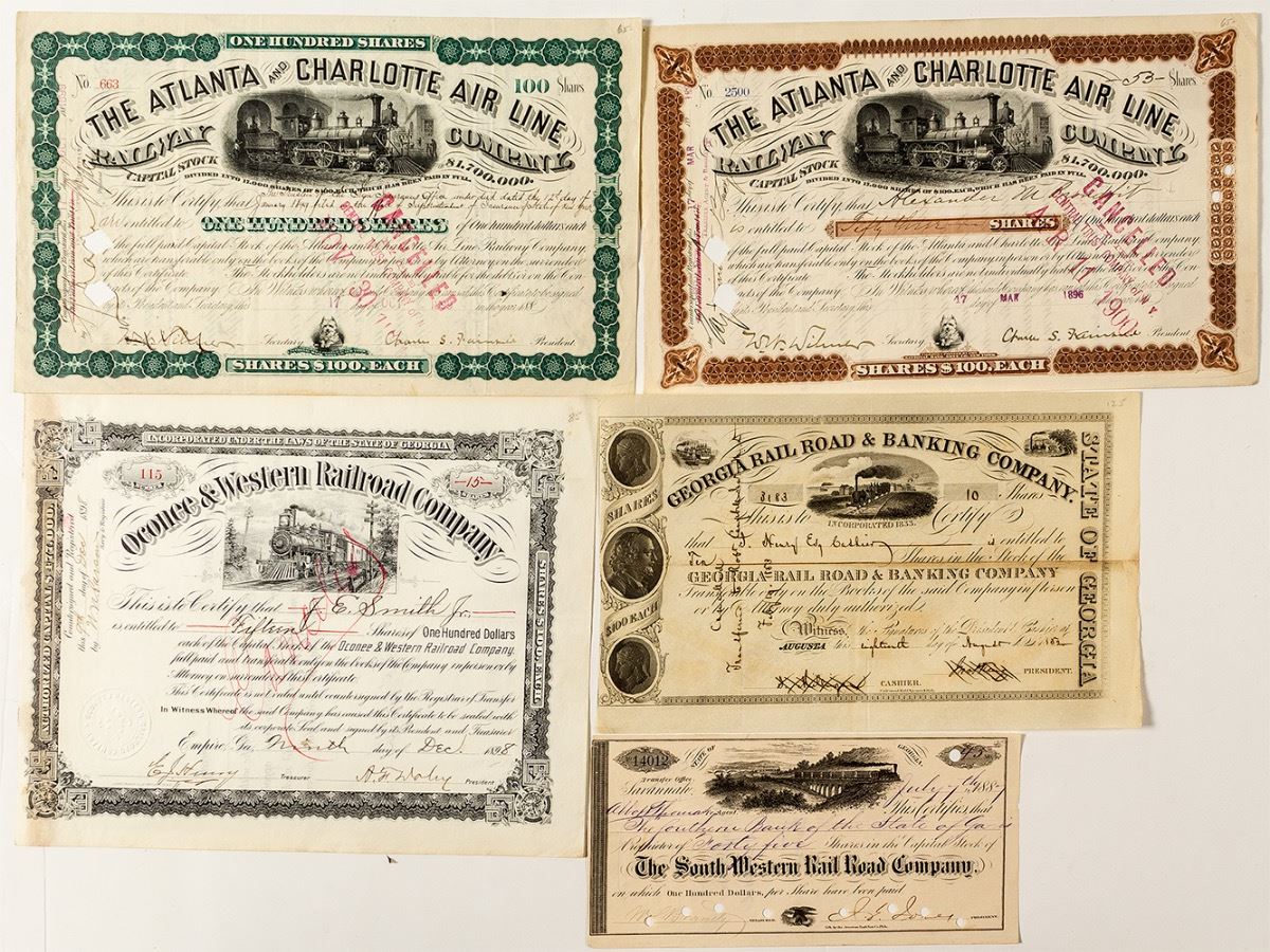 1) The South Western Rail Road Company stock, issued 1887, punch cancelled, small size with train over bridge vignette. 2) Georgia Rail Road & Banking Company stock issued 1852, pen cancelled thru signatures. Early train vignette top center, three profile vignettes along left edge. Clean. 3) Two different style (green and brown border) certificates for The Atlanta and Charlotte Air Line Railway Company, issued 1896 and 1899, stamp and punch cancelled with same attractive locomotive vignette. 4) Oconee & Western Railroad Company stock issued 1898, pen cancelled. Attractive border and train vignette. (Prag Collection) City: State: Georgia Date: 1852-1899 hwac# 33953
