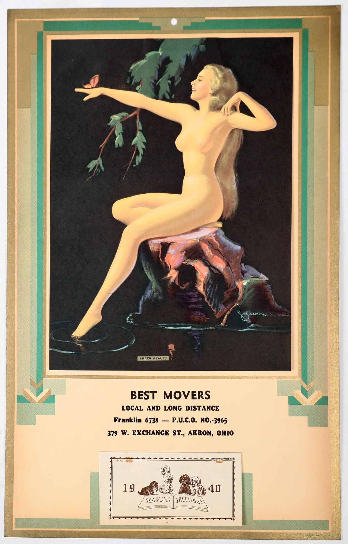 Best Movers, Akron, Ohio nude lady, "Sheer Beauty", advertising calendar, 1940. 14.75x9.5".