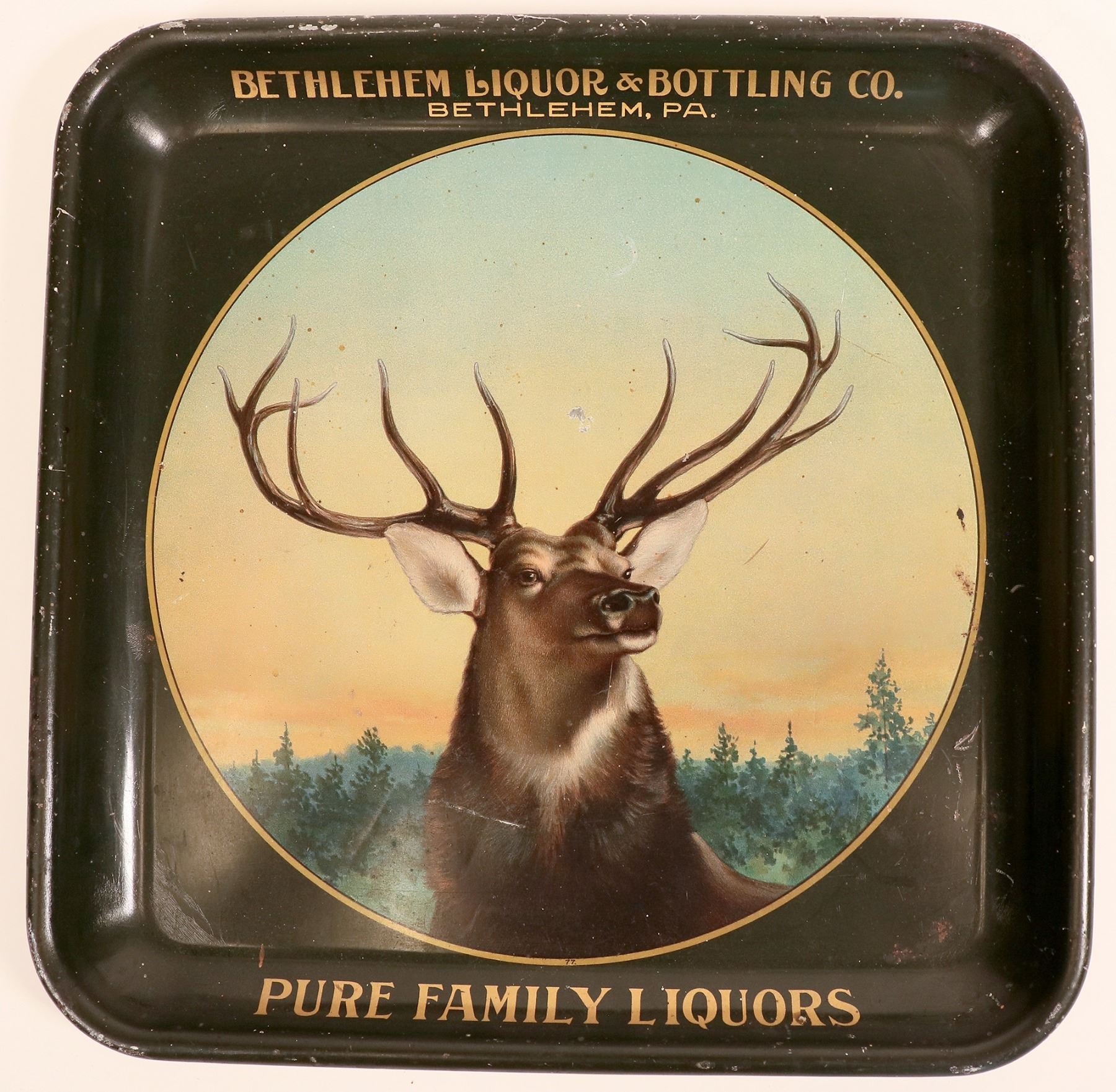 This is a square beer tray from "Bethlehem Liquor & Bottling Co./ Bethlehem, Pa./ Pure Family Liqours" at 13.25 in. X 13.25in. The scene is of a stag. C. 1910, very good condition. Bethlehem Pennsylvania