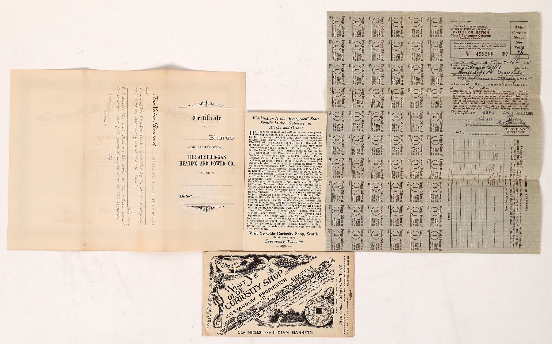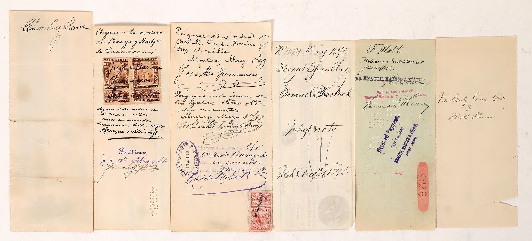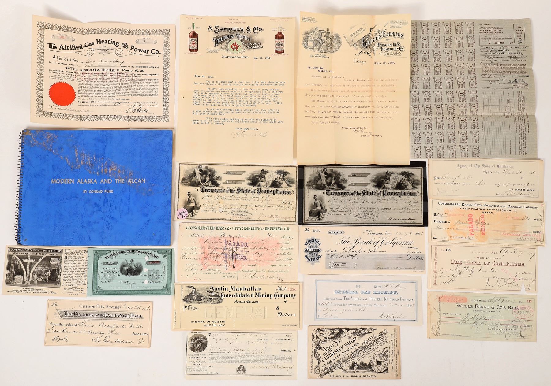 About 20 pieces of better general Americana ephemera c. 1869-1907. NV, NM, PA, WA, TN, AK. Checks, state docs, AK pamphlet, color pictorial letterhead etc.