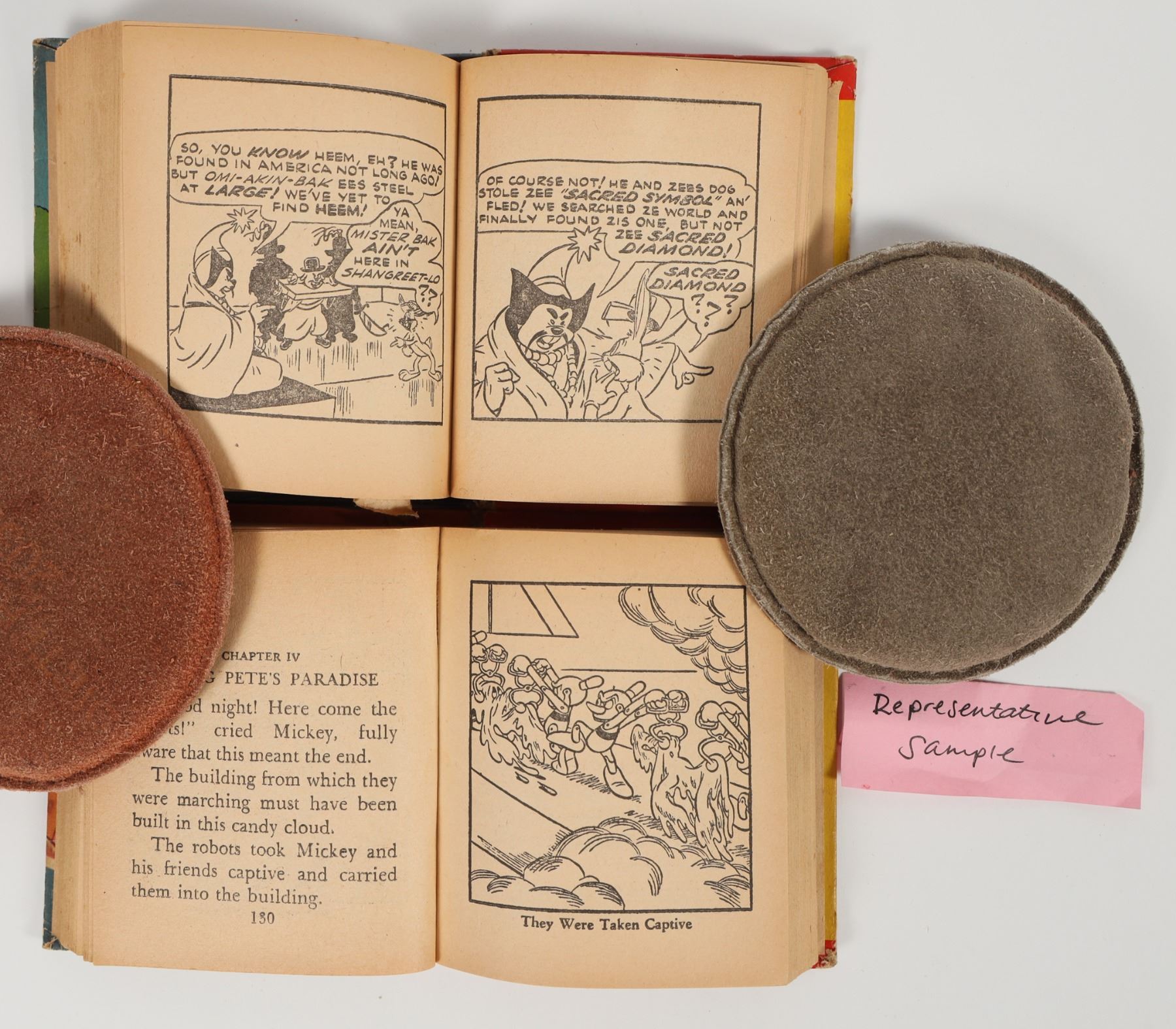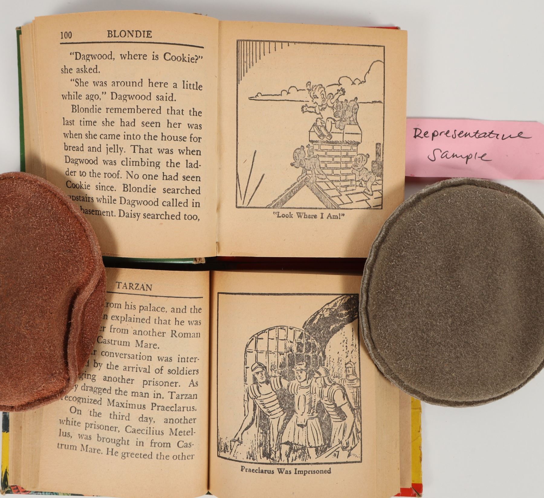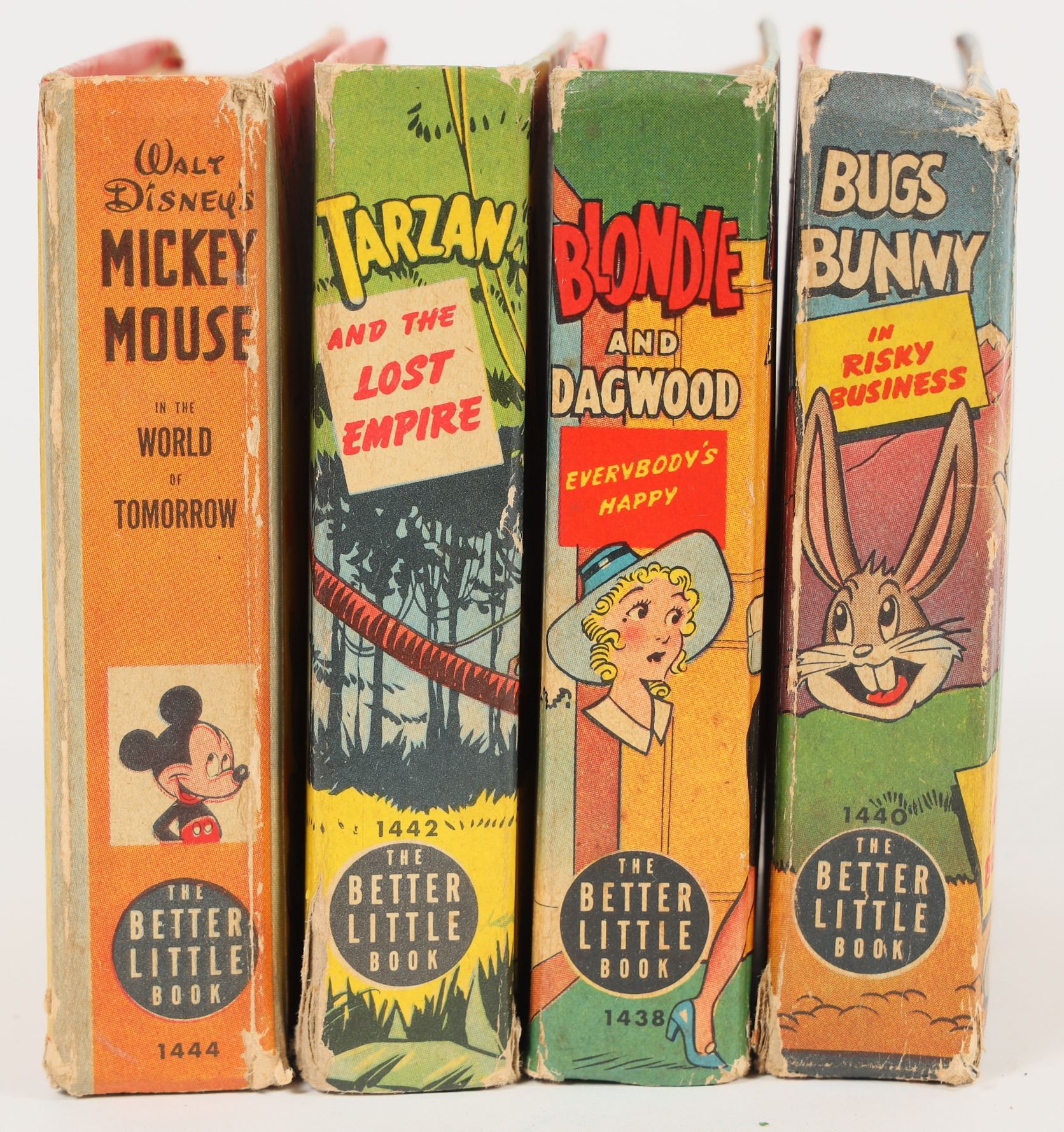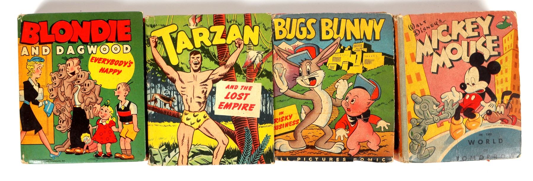 Lot of 4. Better Little Books by Whitman Publishing Co.. 1948, 286 pgs. each, 4x4 1/2". Mickey Mouse, Bugs Bunny, Blonde and Tarzan. Books are in very good cond. Color covers, in tact, no separation, little wear on edges and no tears. Inside pages are clear and readable.