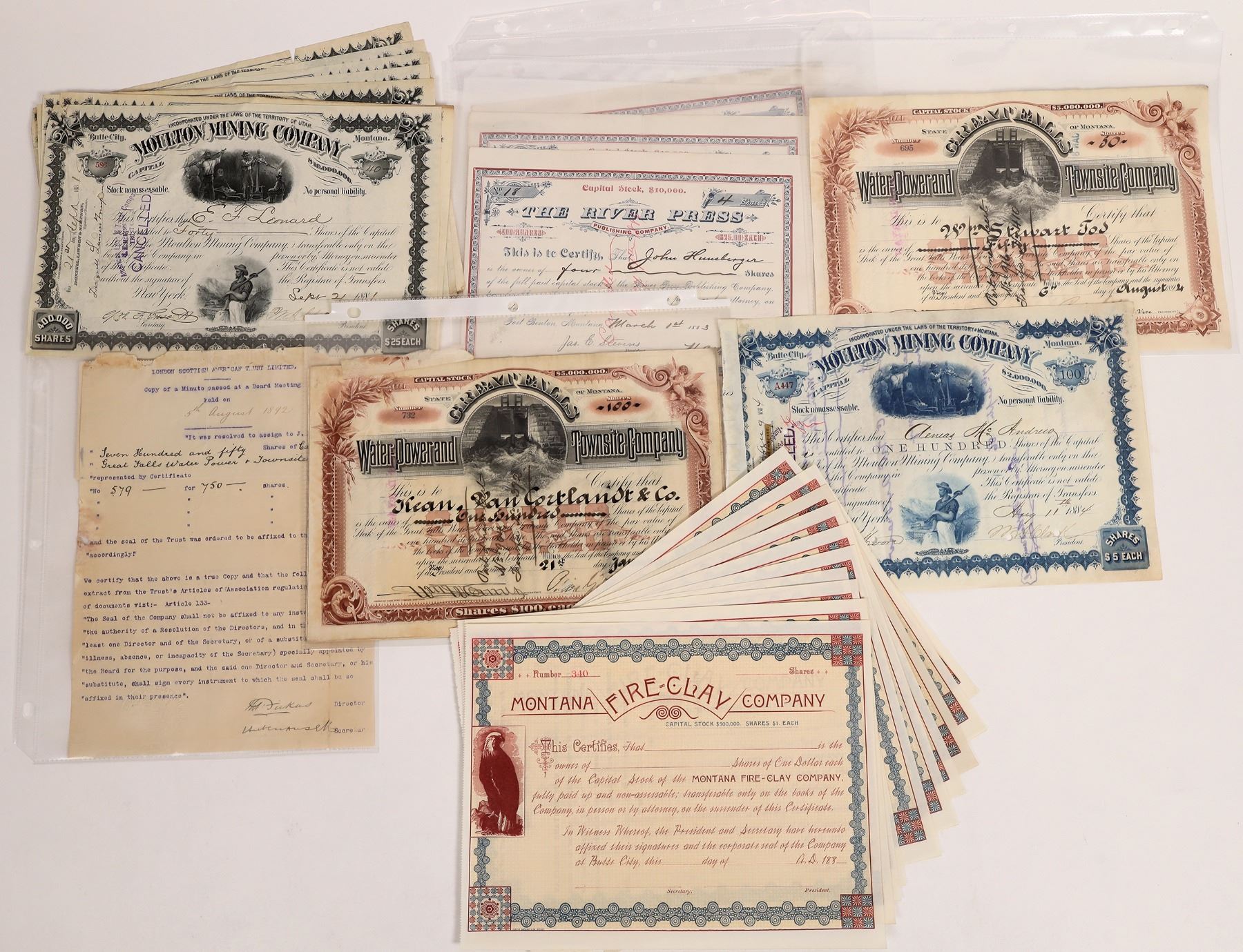 About 20 better issued and unissued Montana mining stocks. Moulton Mining, River Press, Great Falls Water, Montana Fire Clay.