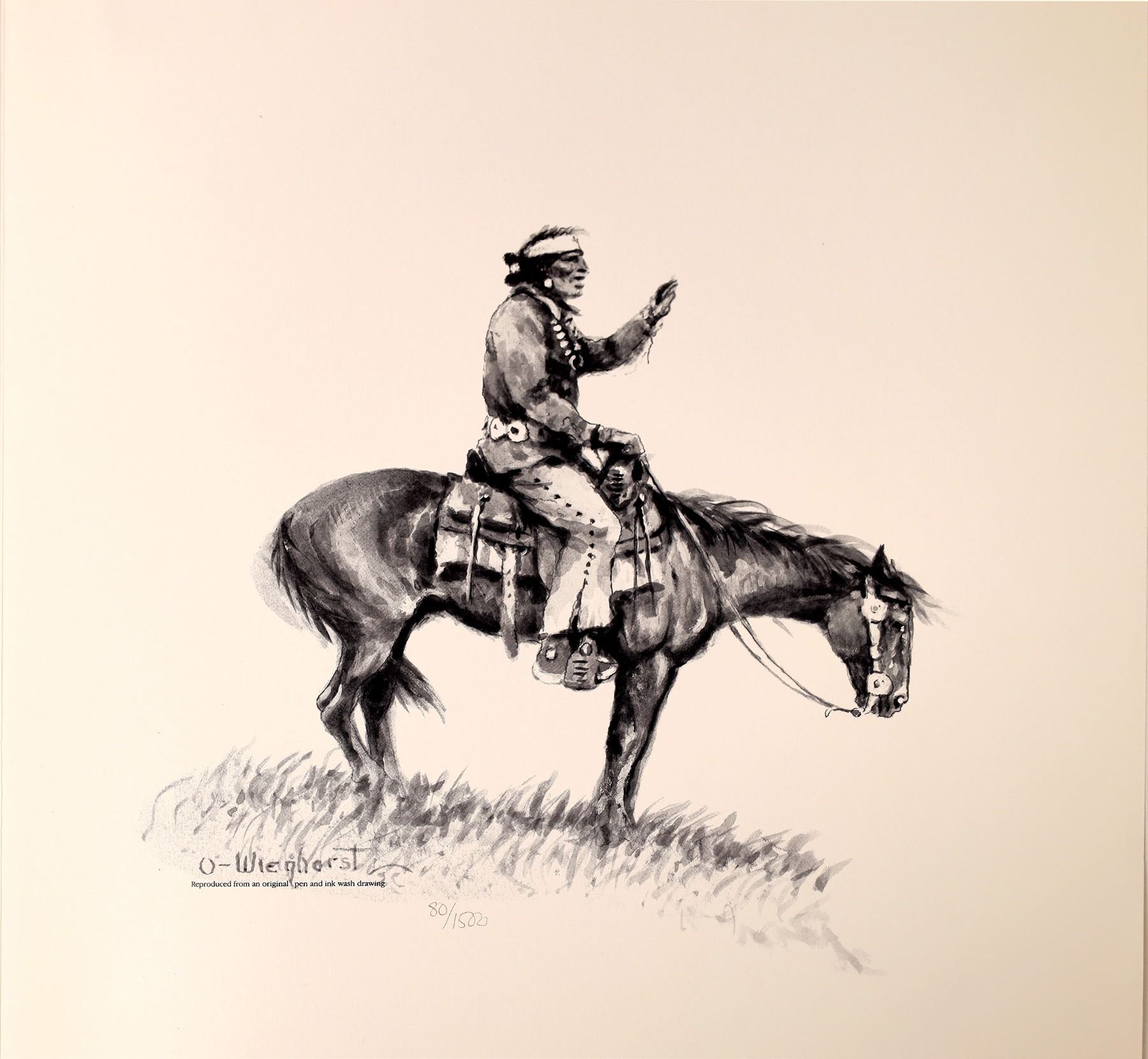 SPECIAL for ART DEALERS -- FIVE PRINTS of PRAYER FOR THE WILD THINGS -- a collaboration between watercolor artist Bev Doolittle and musician Paul Winter. In pristine condition, these prints are fine-art, limited-edition lithographs released in 1993 with 65,000 signed and consecutively numbered pieces. Prayer for the Wild Things is Paul Winter's thirty-second album (but not included in this lot). Bev Doolittle invited Winter to collaborate with her, and according to Doolittle, it is their attempt to surround the viewer with an emotional, visual, and musical message concerning our place in the natural world and our connection to all things wild. These are prints #59,963 through 59,967. All in pristine condition with included certificates. Page measures 24 x 31-1/2 inches, and the image is 21 x 28 inches. LOT ALSO INCLUDES 11 limited-edition, fine-art lithographs by Olaf Wieghorst, please see images for detail, please inspect: 1) THE NAVAJO FAMILY, 452/1500, page is 29-3/8 x 25-1/2 inches, image is 26-1/2 x 22 inches, water spots only on the white margin in lower-right corner; 2) THE NAVAJO FAMILY, 455/1500, page is 29-3/8 x 25-1/2 inches, image is 26-1/2 x 22 inches, water stain 6 inches into the lower-left corner; 3) SUPERSTITION TRAIL, 359/1500, page is 25 x 25 inches, image is 19-1/2 x 18-1/2 inches, light stain on lower-right corner, but not in the image or signature area; 4) WHITE WATER CREEK, 63/1500, 31-1/8 x 25 inches, image is 25-3/4 x 18-1/2 inches, stain 2 inches into the image at upper-right corner; 5) COLD HUNT, 62/1500, page is 31-1/8 x 25 inches, image is 20-3/4 x 18-1/2 inches, stains in upper-right corner margin, but not in the image; 6) SPRING RAIN, 1246/1500, 25-3/8 x 30-3/8 inches, image is 19-3/8 x 23-1/2 inches, spots on 12 inches of lower-left margin, 6 inches into the image, but very difficult to notice; 7) SCOUTING PARTY, 396/1500, page is 29-1/2 x 26-1/2 inches, image is 28 x 19-1/2 inches, stain on upper-left corner, 3 inches into the image. 8) ROUND UP, 155/1500, page is 34 x 26-1/2 inches, image is 28 x 19-1/2 inches, stain 10 inches of lower-right corner, 6 inches into the image, but very difficult to see; 9) ROUND UP, 267/1500, page is 34 x 26-1/2 inches, image is 28 x 19-1/2 inches, stain 12 inches into upper left, visible in the sky/clouds; 10) RUNNING AHEAD OF THE STORM, 49/1500, page is 33-1/8 x 25 inches, image is 27-3/4 x 18-3/8 inches, water warping nine inches into upper-right corner, but not evident when item is framed; 11) LONG WALK OF THE NAVAJOS, 115/1500, page is 29-1/2 x 26-1/2 inches, image is 23-1/2 x 18-3/8 inches.