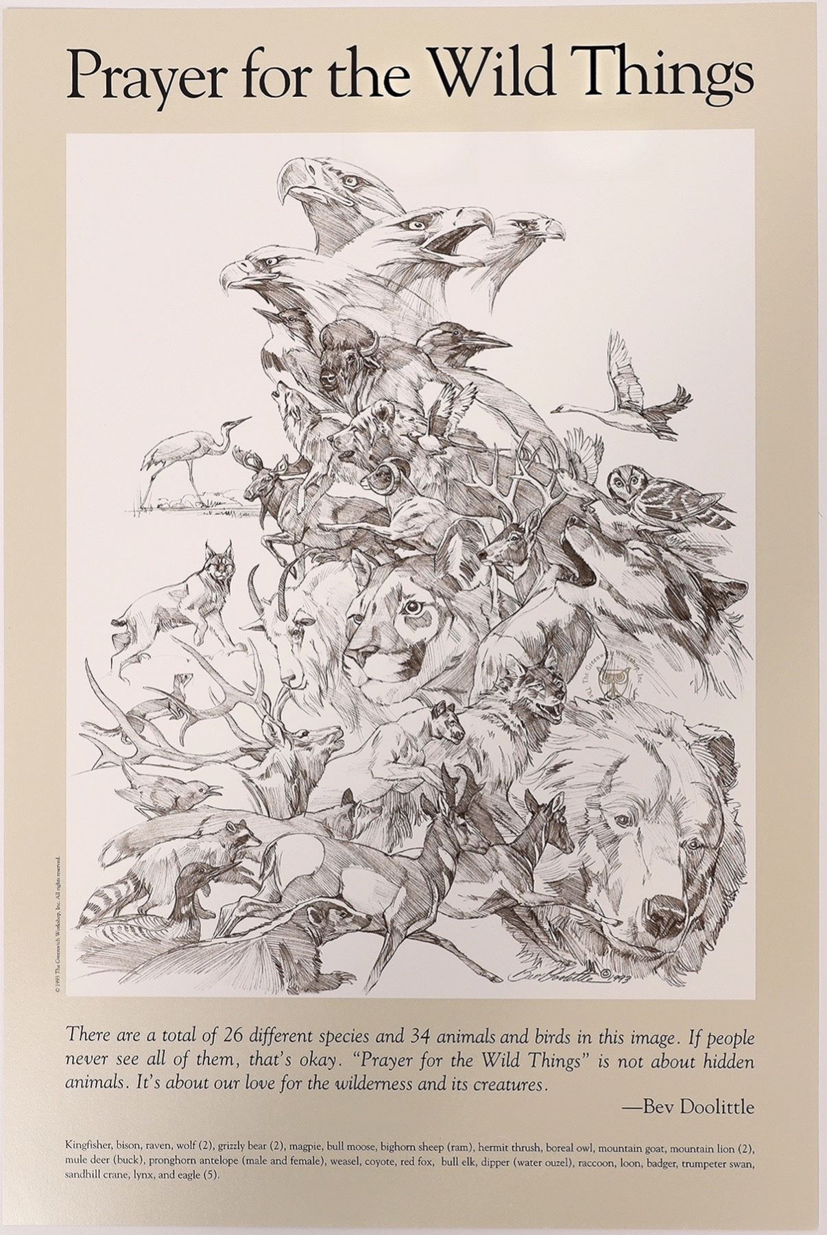 Two separate Bev Dolittle prints: 1) Sacred Circle by Bev Doolittle, a fine-art lithograph released in 1991 with 40,192 signed and consecutively numbered prints. To Native Americans, the circle was a sacred symbol, and our natural environment may also be viewed as a circle of dependent and interconnected natural elements. This print is #24,130. Page measures 26 x 26-1/2 inches, and the image is 23 x 23 inches. 2) Prayer for the Wild Things -- a collaboration between watercolor artist Bev Doolittle and musician Paul Winter. The prints are fine-art, limited-edition lithographs released in 1993 with 65,000 signed and consecutively numbered pieces. Prayer for the Wild Things is Paul Winter's thirty-second album (but not included in this lot). Bev Doolittle invited Winter to collaborate with her, and according to Doolittle, it is their attempt to surround the viewer with an emotional, visual, and musical message concerning our place in the natural world and our connection to all things wild. In pristine condition with included inserts. This is print #49,669 of 65,000. Page measures 24 x 31-1/2 inches, and the image is 21 x 28 inches.