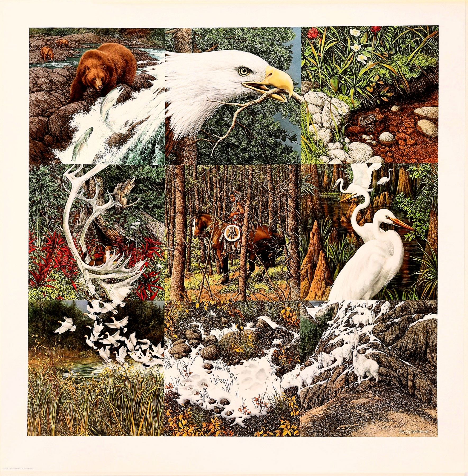 Two separate Bev Dolittle prints: 1) Sacred Circle by Bev Doolittle, a fine-art lithograph released in 1991 with 40,192 signed and consecutively numbered prints. To Native Americans, the circle was a sacred symbol, and our natural environment may also be viewed as a circle of dependent and interconnected natural elements. This print is #24,131. Page measures 26 x 26-1/2 inches, and the image is 23 x 23 inches. 2) Prayer for the Wild Things -- a collaboration between watercolor artist Bev Doolittle and musician Paul Winter. The prints are fine-art, limited-edition lithographs released in 1993 with 65,000 signed and consecutively numbered pieces. Prayer for the Wild Things is Paul Winter's thirty-second album (but not included in this lot). Bev Doolittle invited Winter to collaborate with her, and according to Doolittle, it is their attempt to surround the viewer with an emotional, visual, and musical message concerning our place in the natural world and our connection to all things wild. In pristine condition with included inserts. This is print #49,670 of 65,000. Page measures 24 x 31-1/2 inches, and the image is 21 x 28 inches.