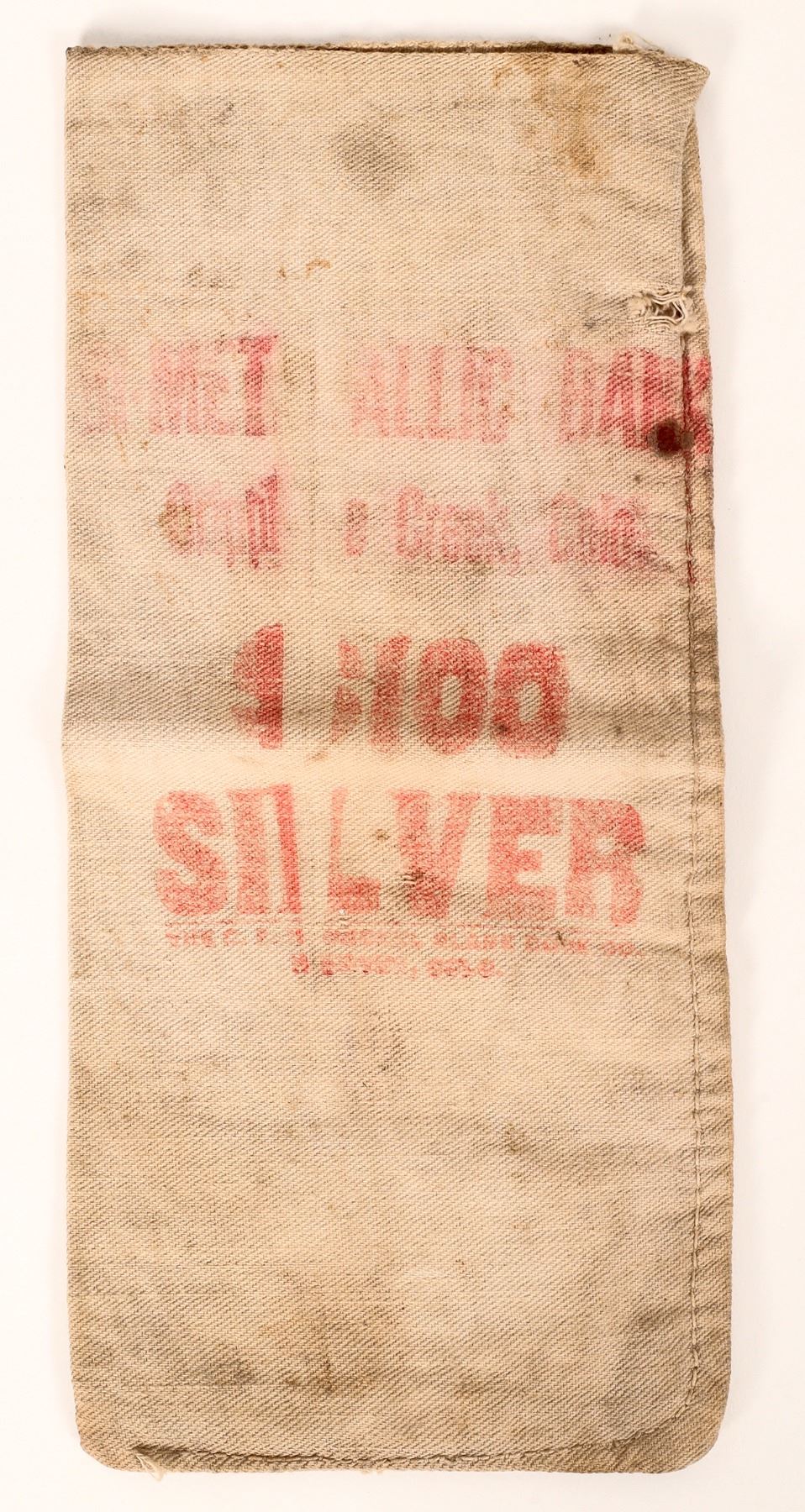Rare Bi Metallic Bank, $100 silver cloth coin bag. 9x4", some staining and fading, no tears. Colorado Cripple Creek Gary Bracken Collection