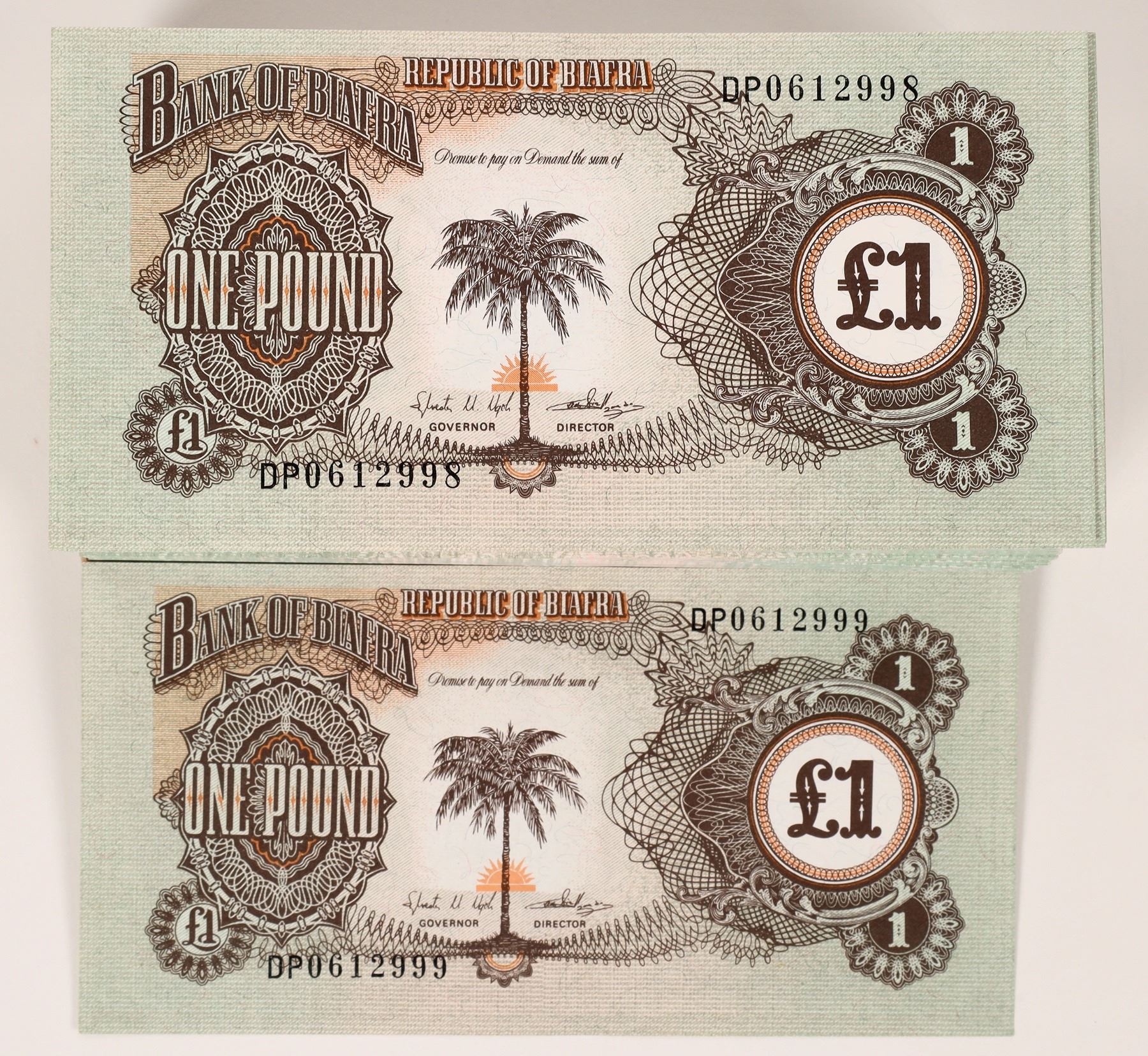 Bank of Biafra one pound bank notes #5a (Pick) - E1 (1968-9), crisp UNC, 500 pieces. The Republic of Biafra, was a partially recognised secessionist state in West Africa that declared independence from Nigeria and existed from 1967 until 1970. Its territory consisted of the former Eastern Region of Nigeria.