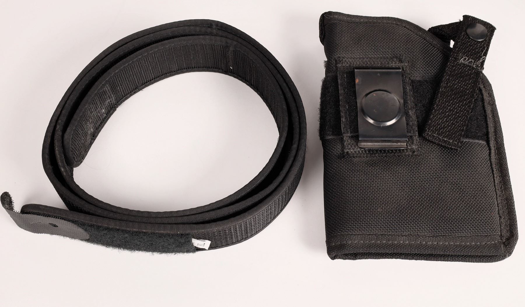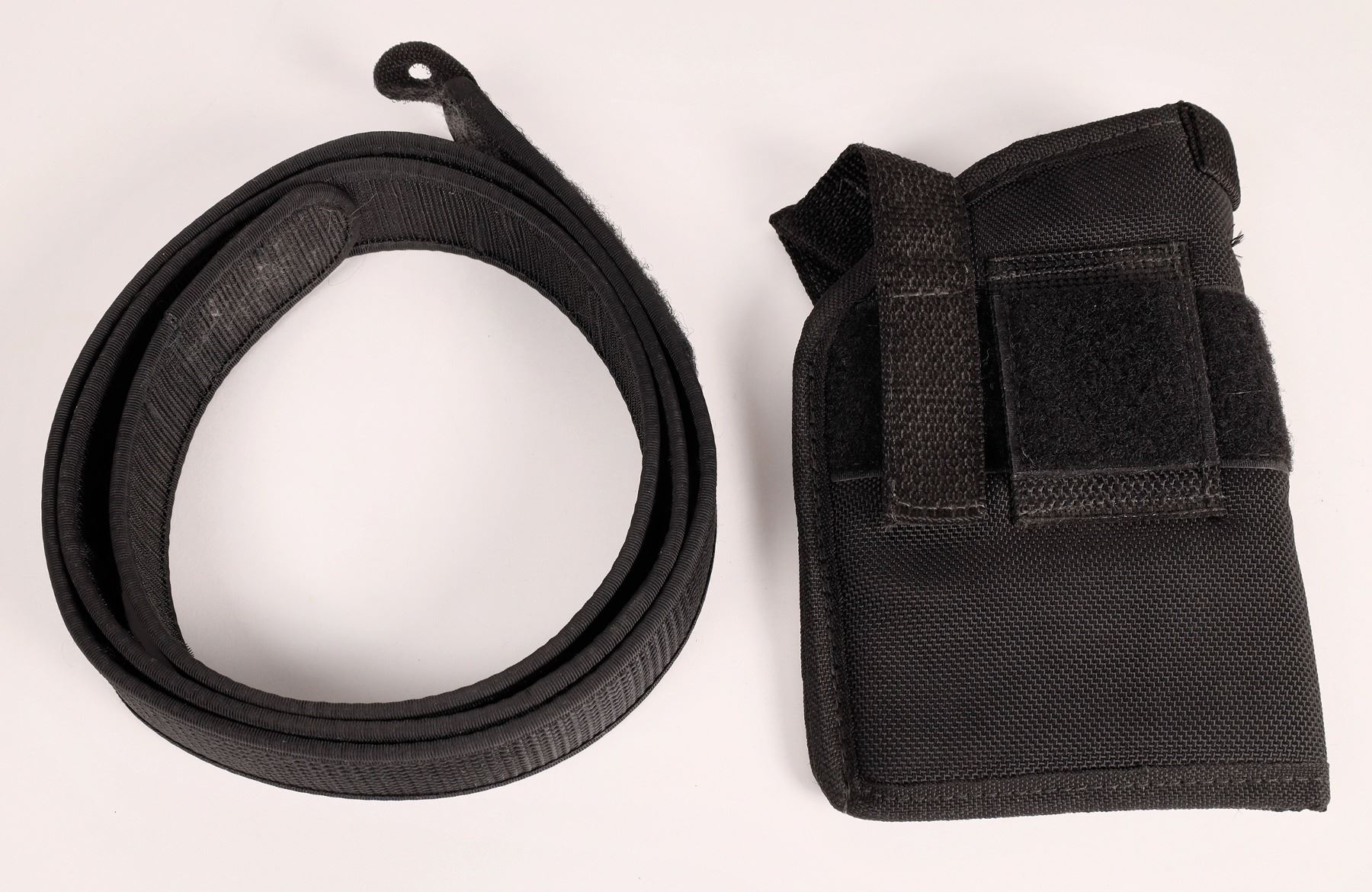 This is a Bianchi ballistic weave holster with a thumb release that is completely adjustable by hook and loop placement. The holster appears to be a universal fit for right hand carry, both inside the waistband and outside the waistband. The interior is a poly-knit lining and completely open at the bottom. It looks to accommodate most 1911 style pistols. The nylon ballistic weave belt is included. In very good condition. 5 in. X 7 in. holster, the belt is XL at 54 in.