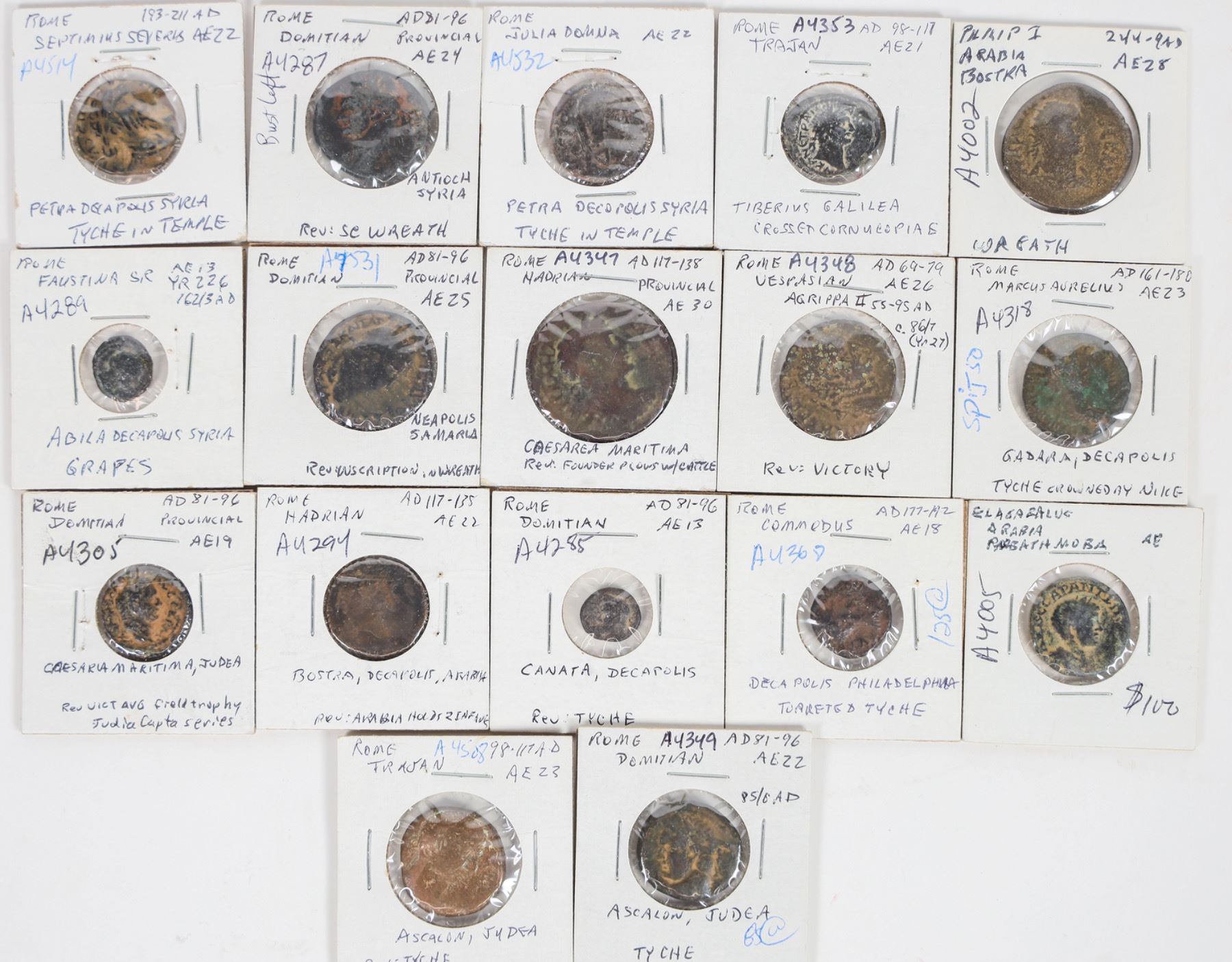 Biblical coins and coins of the Decapolis: Petra, Abila, Bosra, Philadelphia. Larger bronzes in fine or better. Agrippa II, Domitian, Trajan, Hadrian.