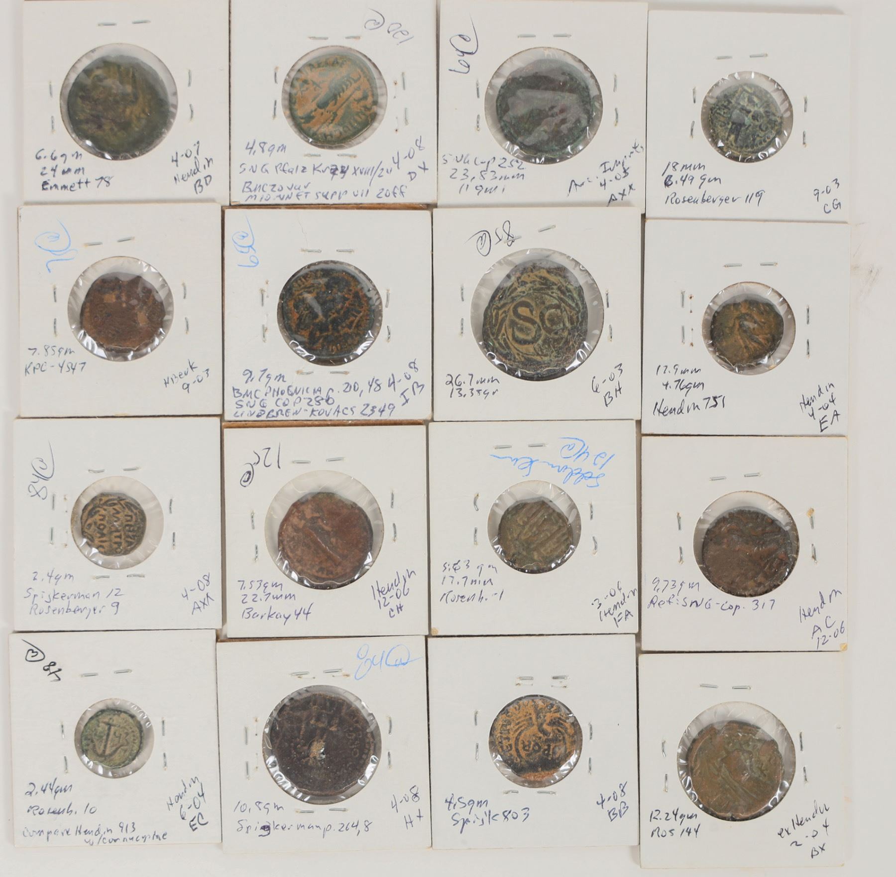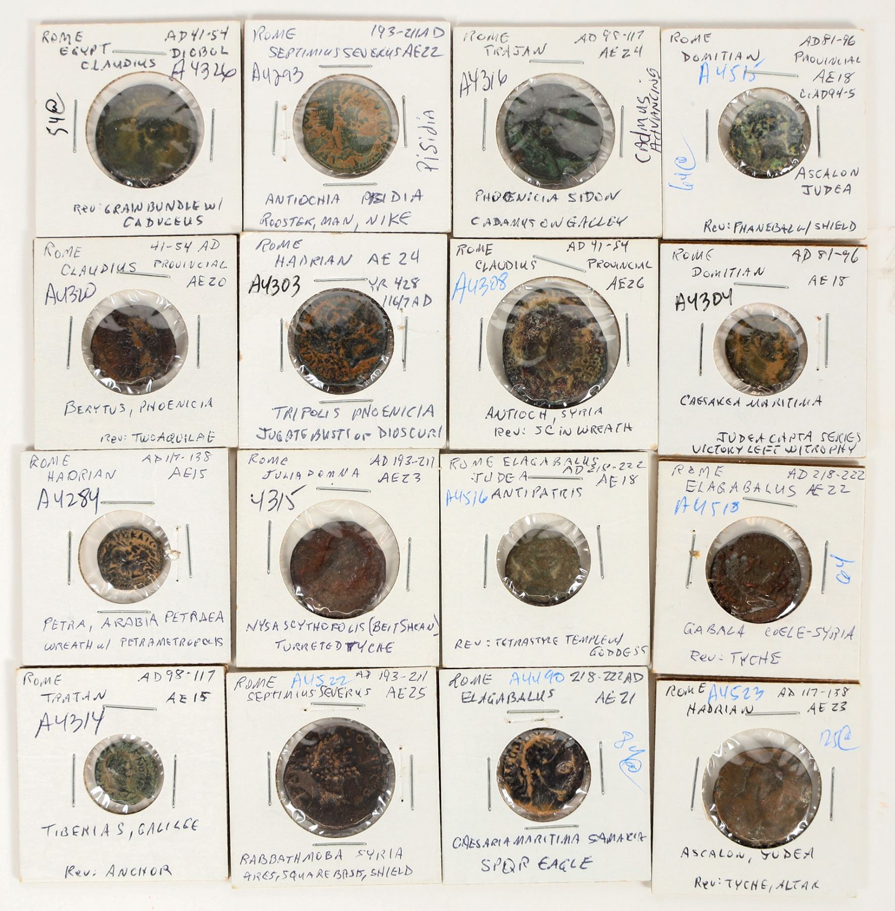 Sixteen bronze coins, fine or better from biblical places: Galilee, Caesarea, Judea, Antioch, Petra, Ascalon, Tripoli, Sidon, Berytus and others.