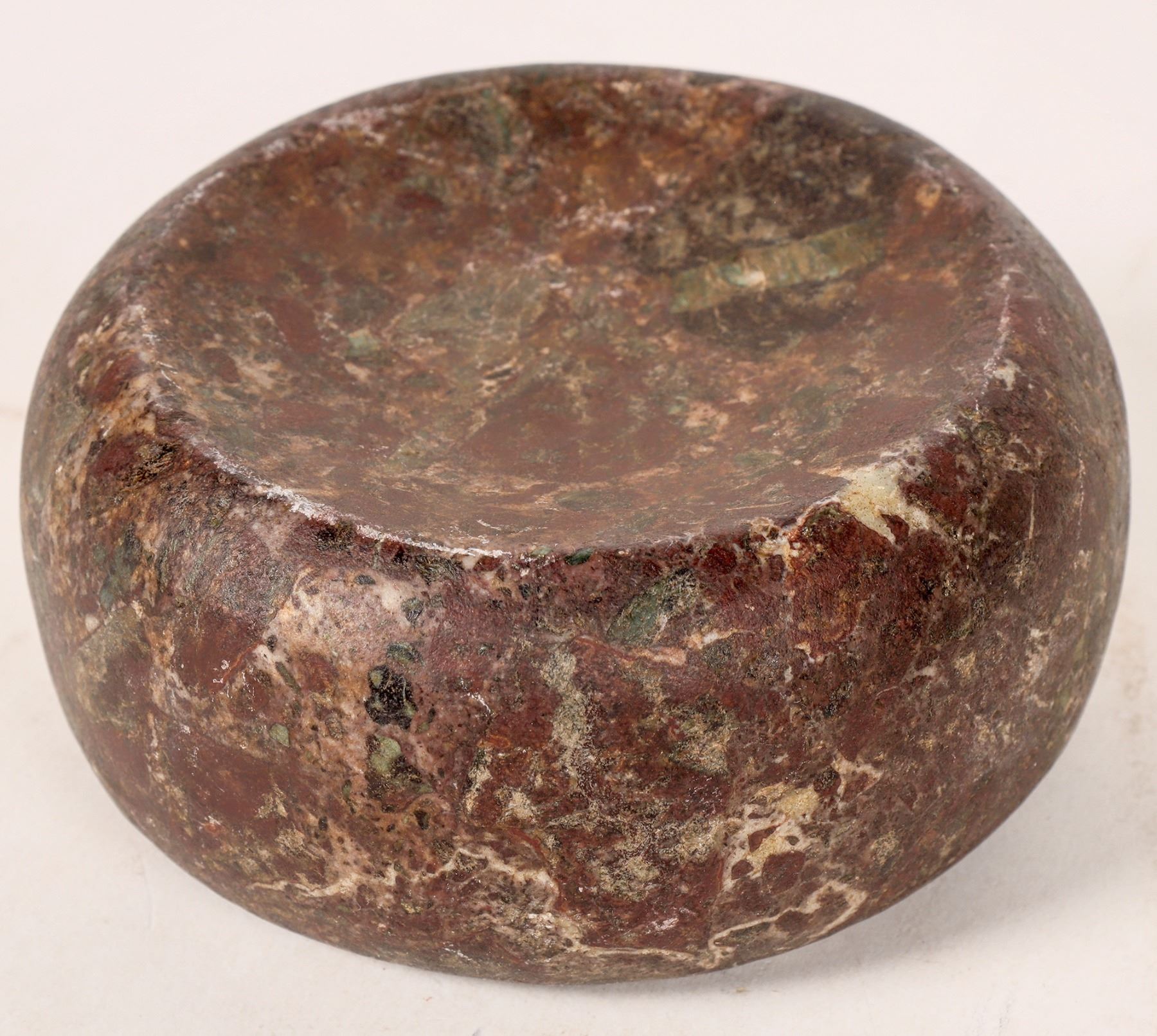 This bicave stone is one of the largest from the Bracken collection. The stone is 4.5 in. X 2 in. at 2 lbs. 9 oz. It was found near Oolagah, Ok. It is perfectly shaped and dished. Its color is a spectacular maroon red with green inclusions. These stones are sometimes called discoidals. The true usage of these stones has mystified archeologists but thought to be a gaming stone or hurling stone. They are found from the Canadian border to the Southern United States. This is an analogy from observing current Native Americans at play. (ref. Moorehead, 1983, pp. 163-4). Please see photos for details. Oklahoma