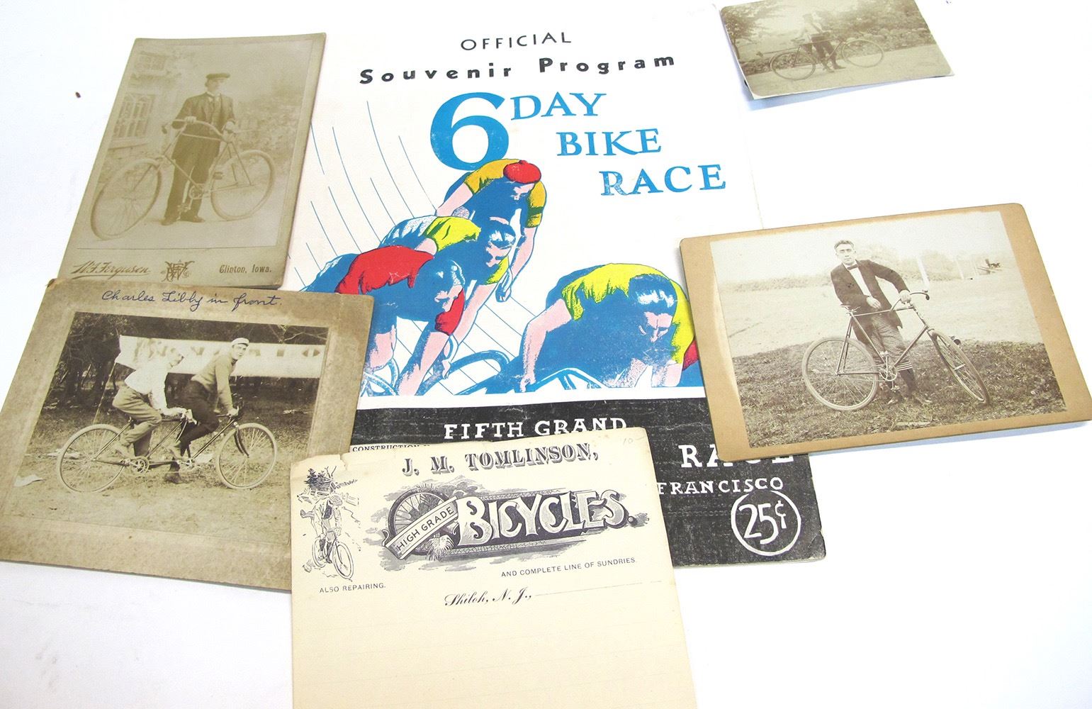 Lot of 6. Includes: 4 old b/w bicycle photos, JM Tomlinson High Grade Bicycles pictorial letterhead, souvenir program from January 1936 San Francisco Bike Race. 22pp. Date: Location: San Francisco, California HWAC # 54932