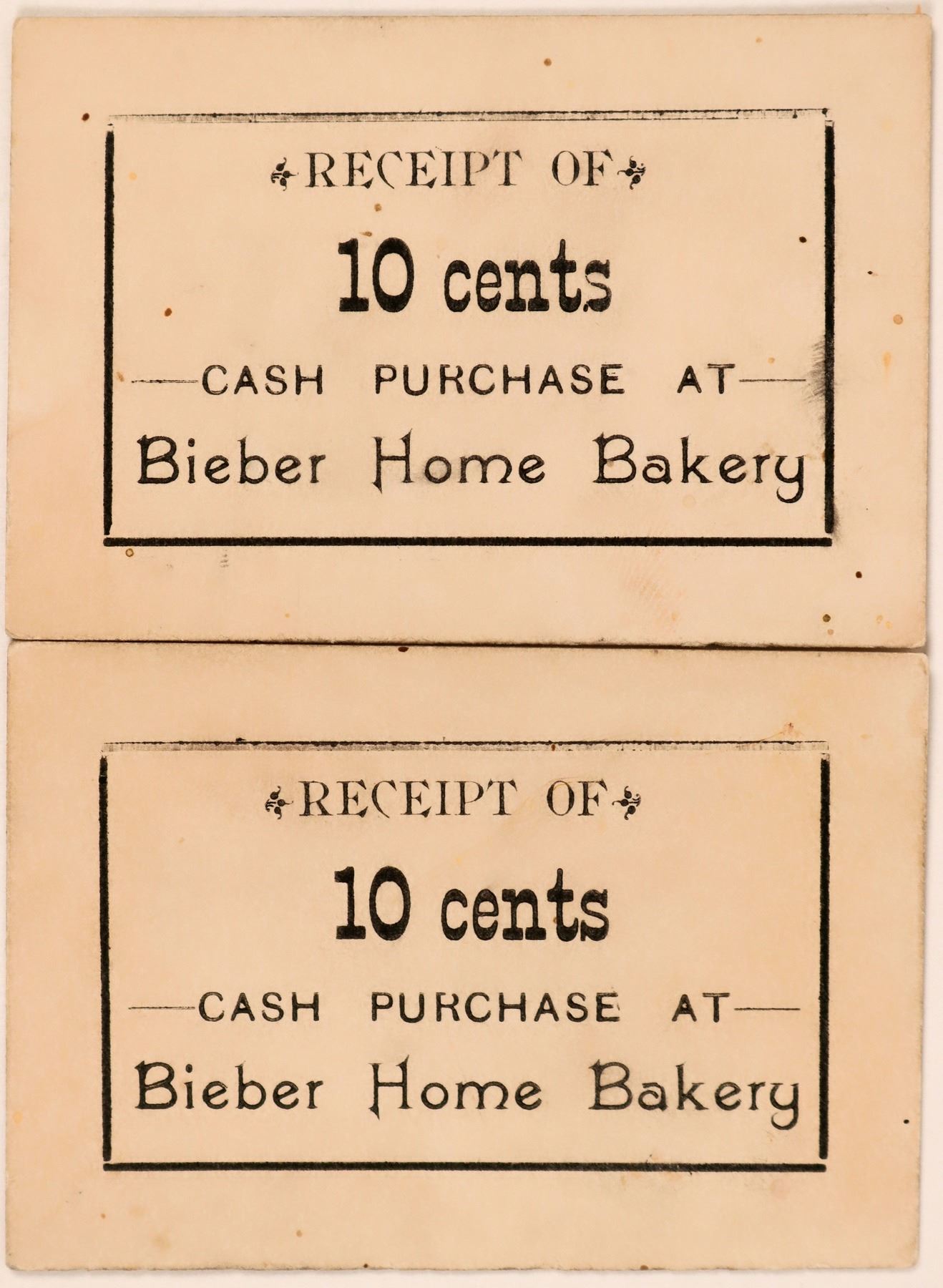 Two cardboard tokens GF 10c cash purchase at Bieber Home Bakery. Bieber is located on the Pit River, 55 miles northwest of Susanville. Ex: Ron Lerch Collection.