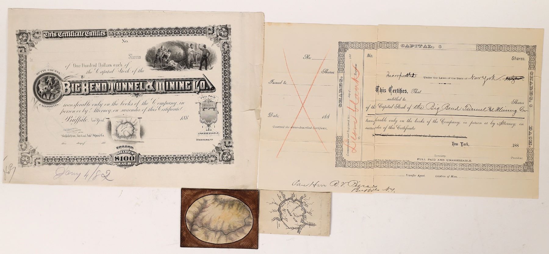 Includes 4 pieces. Original proof with drawings. A great example of a proof from one of the bank note company archives, complete with the original art for the Big Bend drawing on the certificate. The term "big Bend" refers to the big bend on the north fork of the Feather River at Whiskey Bar. The detailed map shows Hamilton Bar, Stone House Bar, Wild Yankee Bar, Berry Creek Bar, etc. There is an original sketch map on a CDV sized card that was used for the vignette. This is an excellent printer's file of original material. Herzog Collection. Butte County California United States of America
