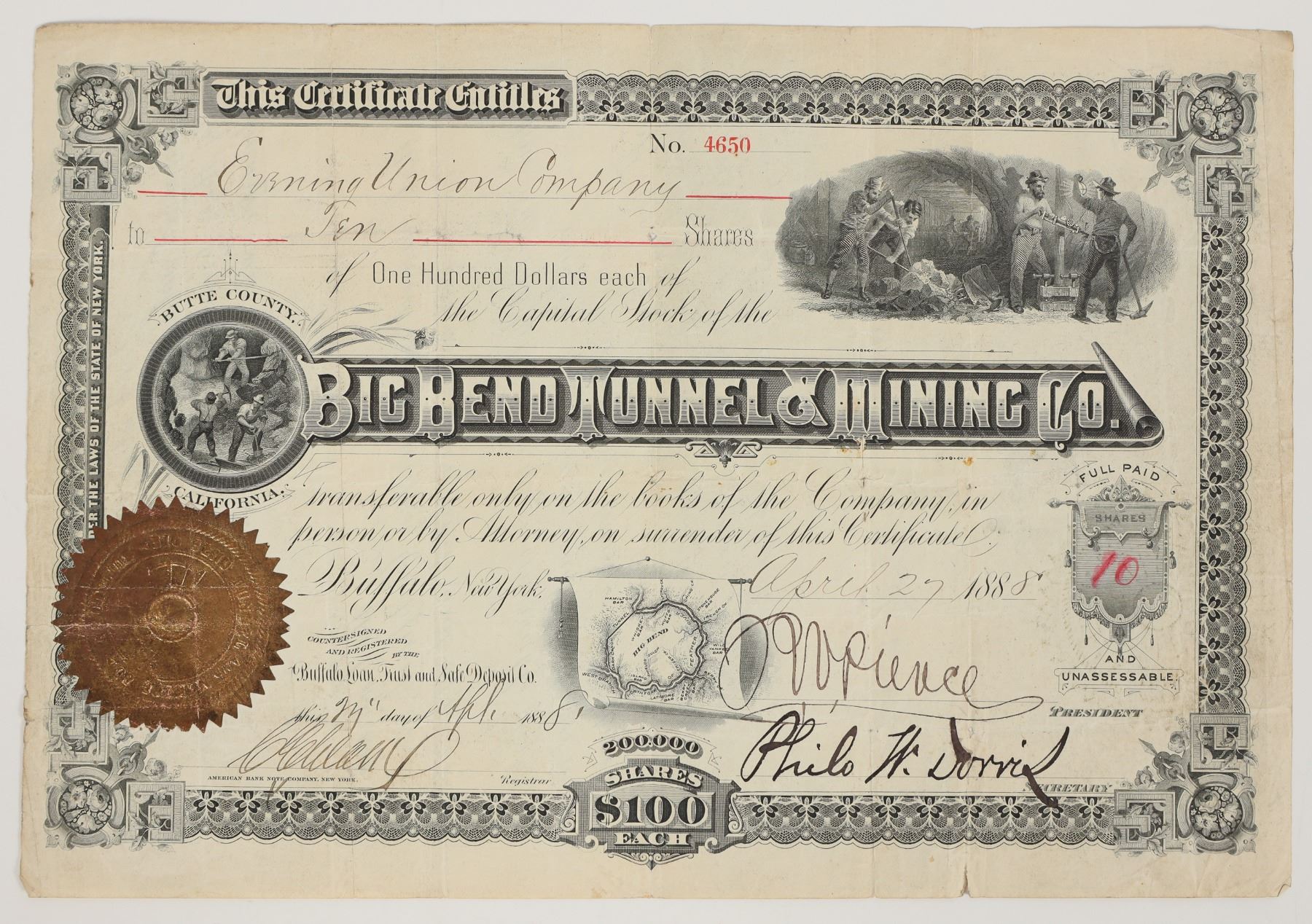 "Butte County, California" printed around oval mining vignette. Second mining vignette at upper right. Also, a very unique vignette that is a map of the company property of the Island Bar on the Feather River, Butte County! No. 4650, issued for ten shares to Evening Union Company in 1888 in Buffalo. Signed by president Pierce and the secretary. Not cancelled. Pinholes, many folds with some small holes.