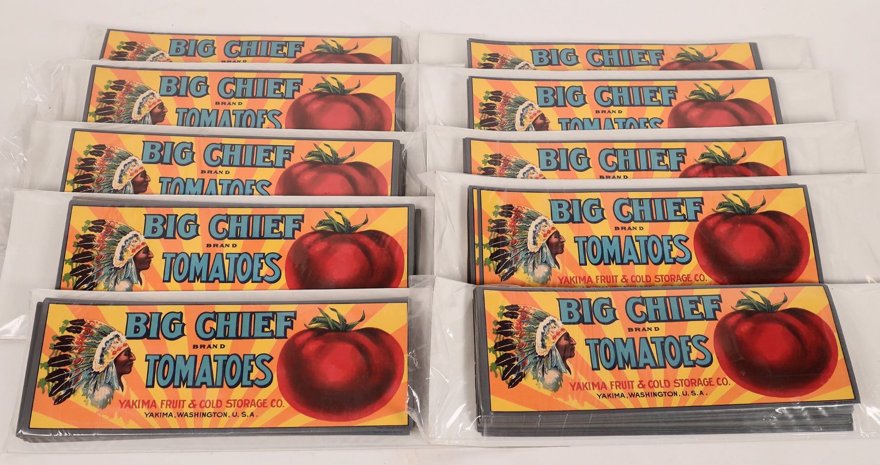 Paper labels for Big Chief Brand Tomatoes from Yakima Fruit & Cold Storage Co. of Yakima, Washington. Orange and yellow radiating background with Native American in full feathered headdress on left, big red tomato on the right. No weight or volume indicated. 10-7/8 x 3-7/8 inches, ten packs of ~100 each.
