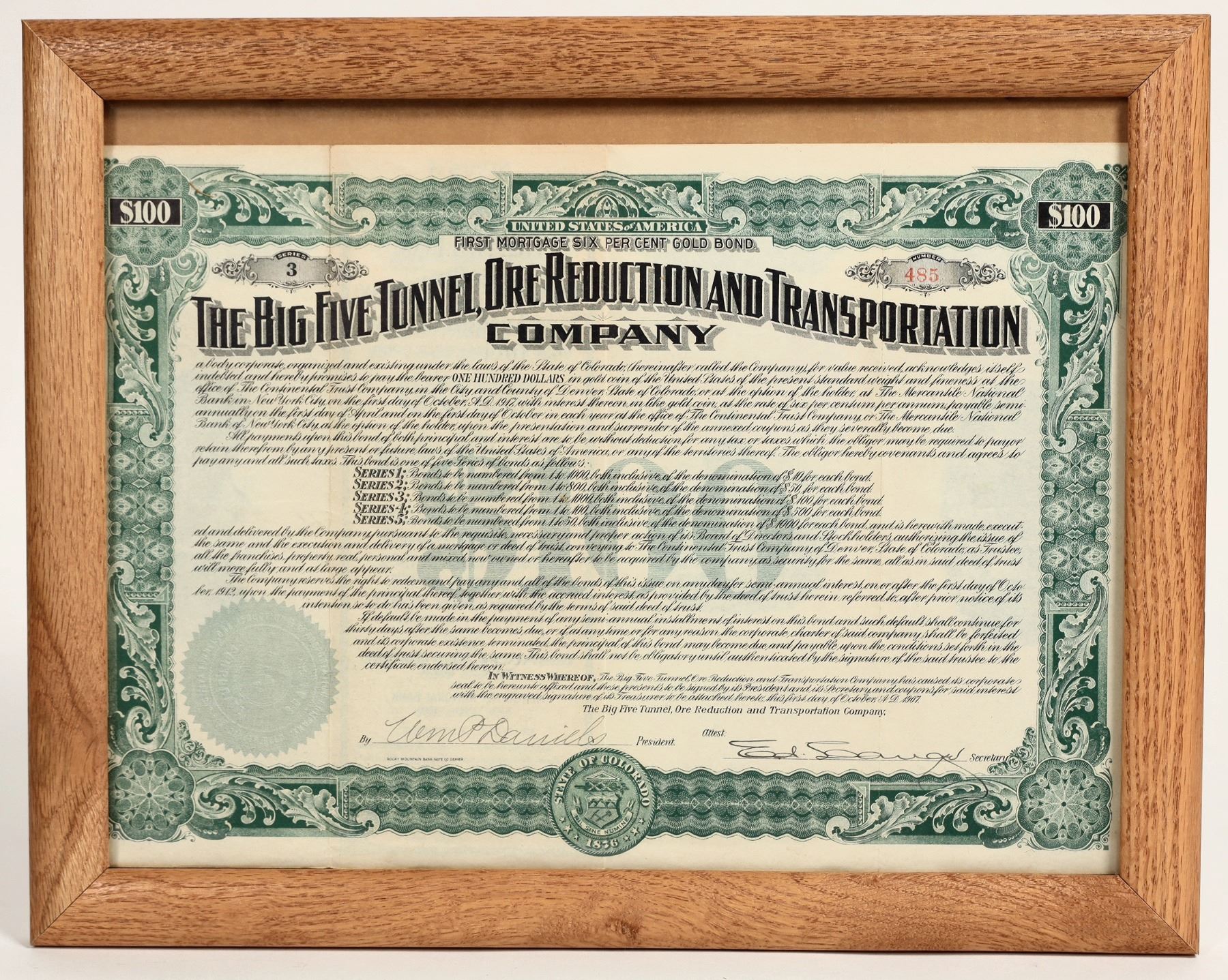 This is a bond certificate for the Big Five Tunnel Ore and Transportation Co. of Idaho Springs, Colorado dated 1907. This tunnel ran for 9000 ft. for several developed claims. Later it was reorganized as the Big Five Mining Company. A series three bond signed by President William Daniels. Three folds minor foxing. Framed at 12 in. X 15 in. Please see photo for details.