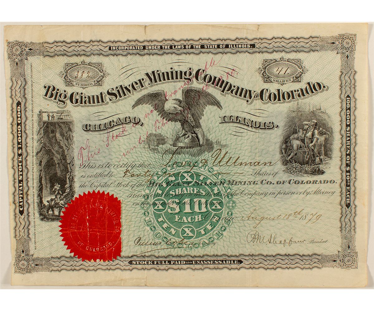 Inc. in Chicago, Illinois. No. 382. Uncancelled. Issued for 41 shares to Levy & Ullman on Aug. 18th, 1879 in Chicago. Signed by P.M. Shaffer (president) and Colver (secretary). Large, red company seal at left (missing right edge). Three vignettes: bald eagle (center), miners and bucket (left and right). Green underprint and black print. Eureka and San Juan counties. Measures 11 ¾" x 8 ½." Condition: folds, light wrinkling, toning, and a few small tears around the edges.City: County: State: CODate: