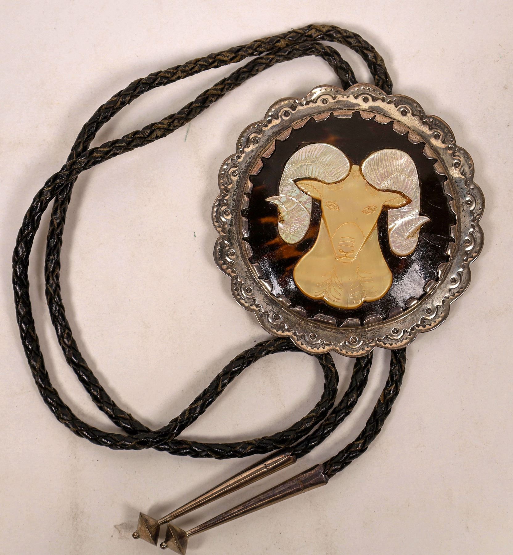 Etched inlay of abalone shell and mother of pearl on tortoise shell. Round, set in silver 3.5" diameter. Very like the style of Elliot Qualo, but artist is unknown. Fabulous piece. Black leather tie with silver tips.