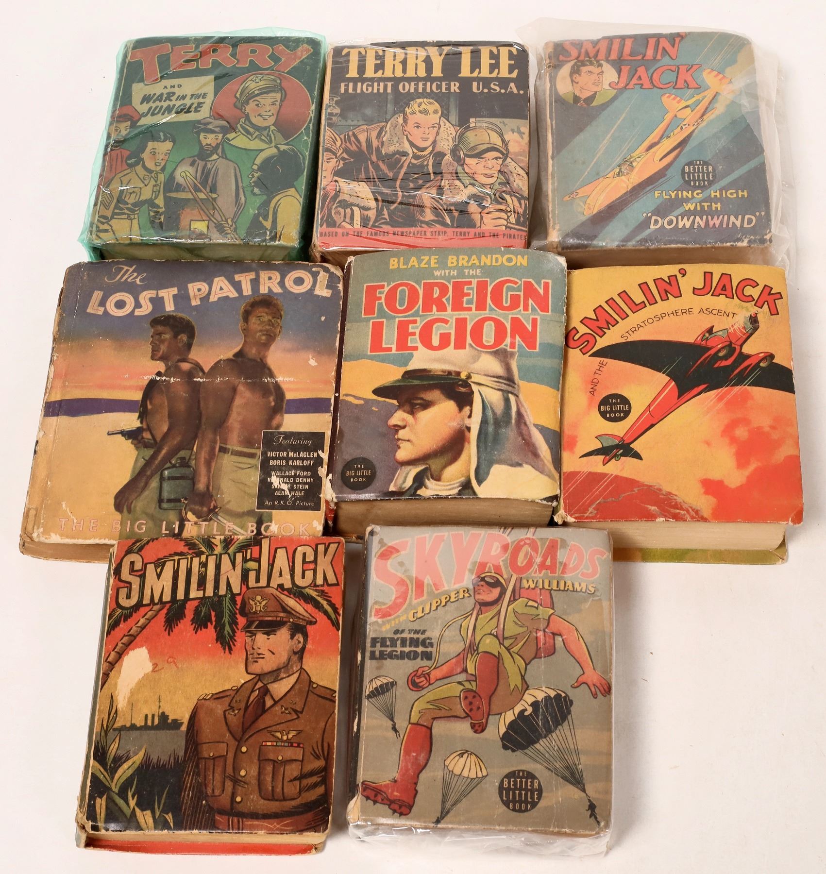 7 Big Little Books. The Lost Patrol, Terry and War in the Jungle, Smilin' Jack and the Stratospheric Ascent, Terry Lee Flight Officer USA, Smilin' Jack Flying High with Downwind, Smilin' Jack and the Coral Princess, Skyroads of the Flying Region. Good to very good condition.
