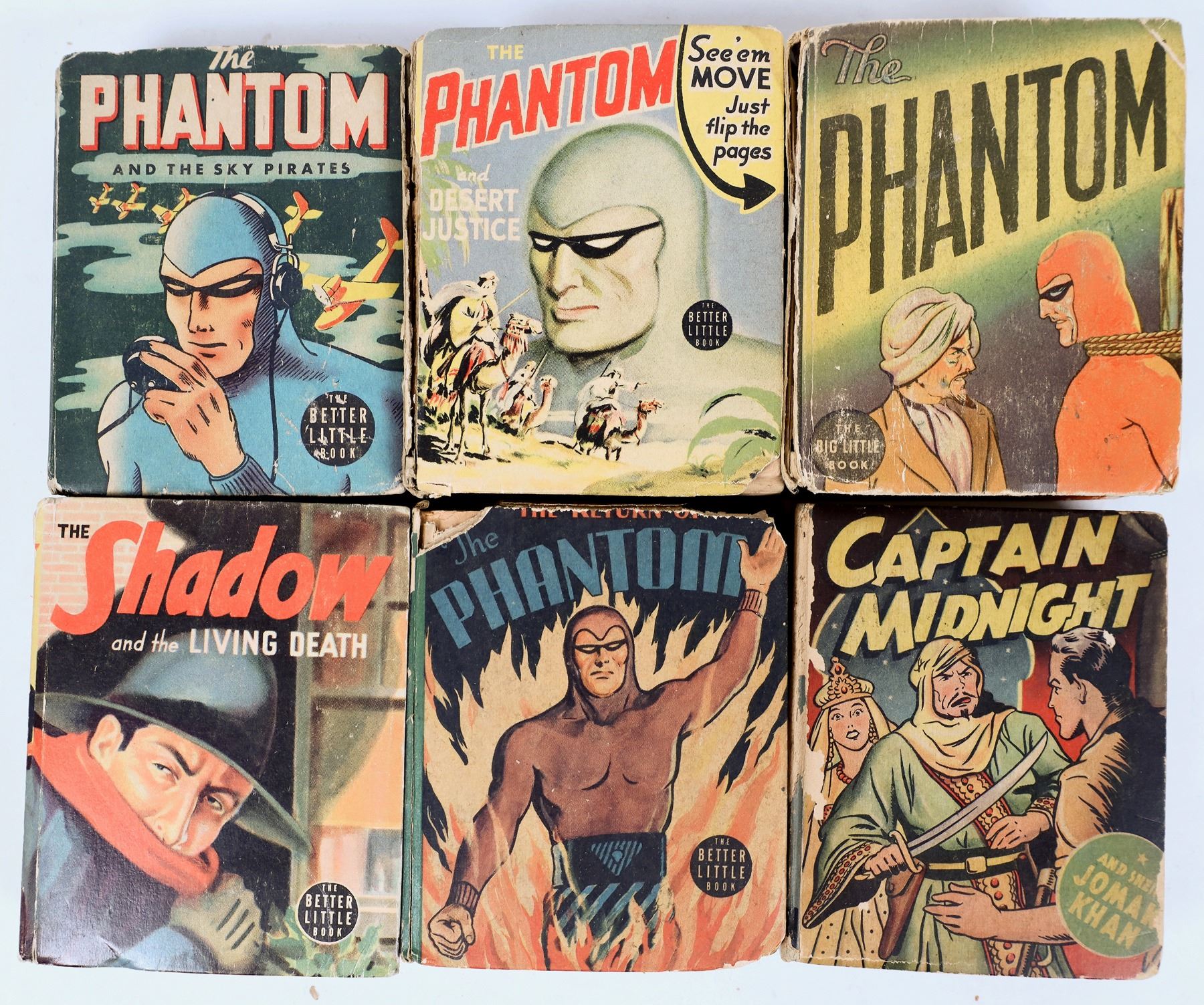Six Little Big Books featuring 2x the Phantom, The Phantom and Desert Justice, The Phantom and the Sky Pirates, The Shadow and the Living Death, Captain Midnight. Poor to good condition.