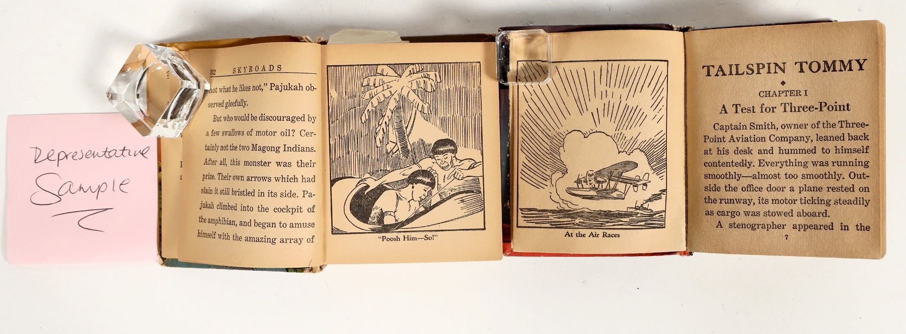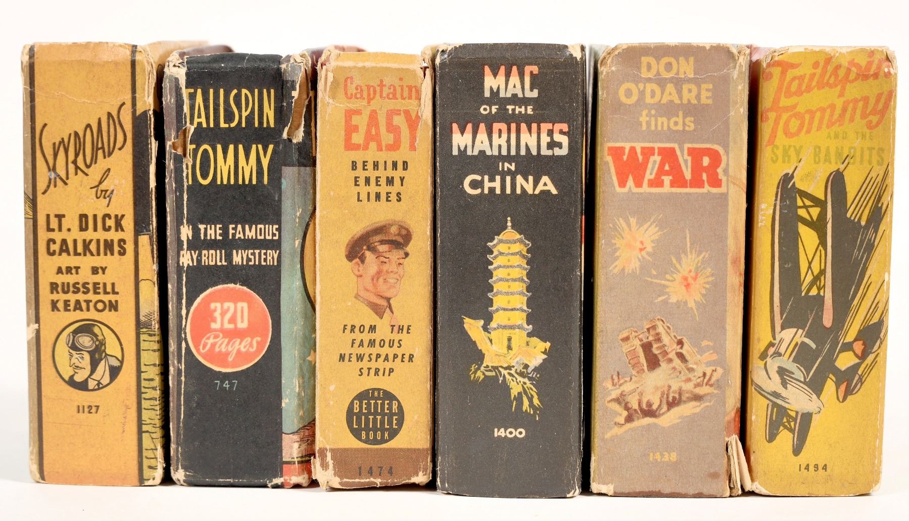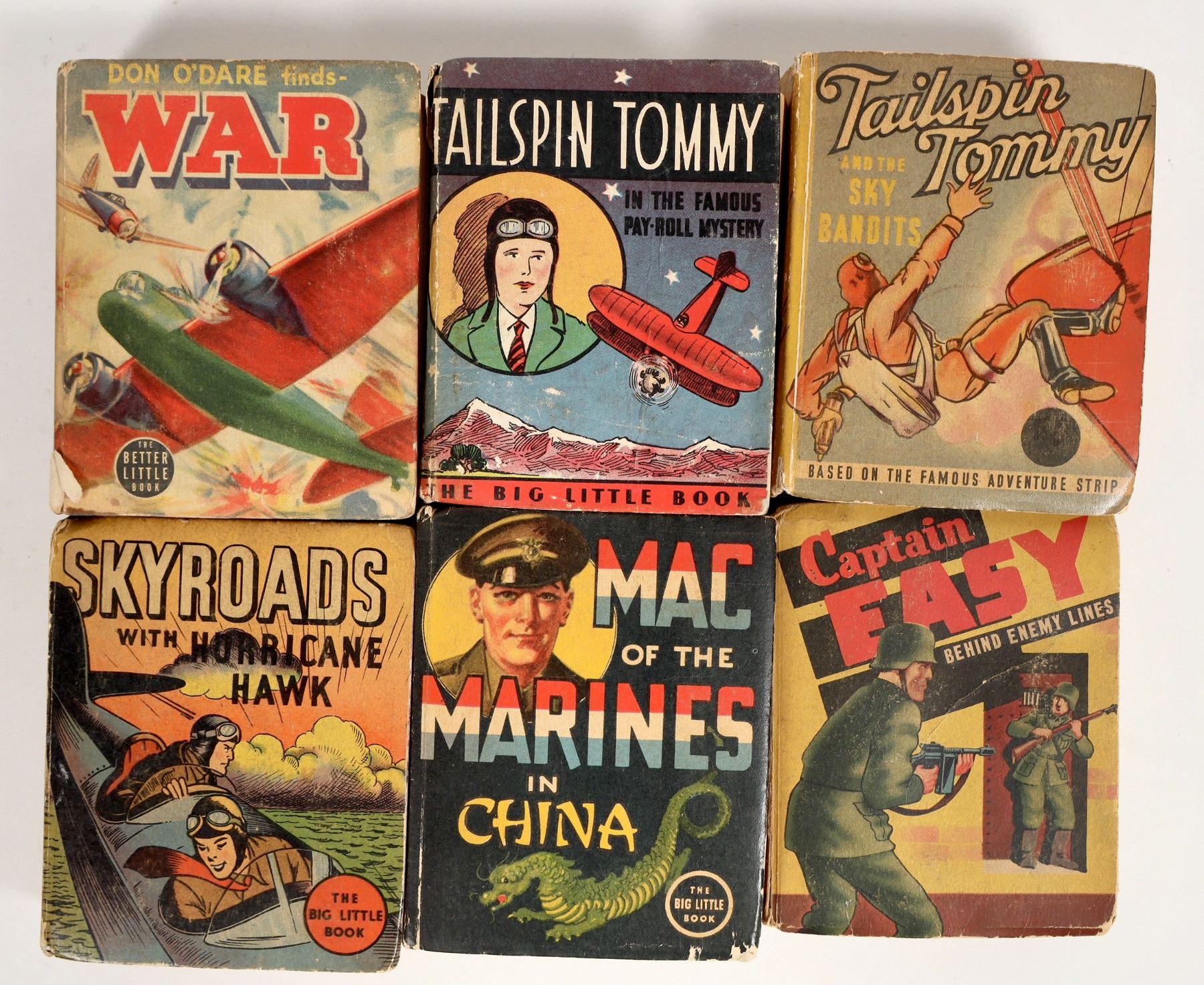 This lot consists of 6 books, including stories on the characters Captain Easy, Mac of the Marines, Hurricane Hawk, Don O'Dare, and Tailspin Tommy (2). All books produced by the original Whitman company. All have noticeable toning, some with significant spine wear/detached pages; see photos.
