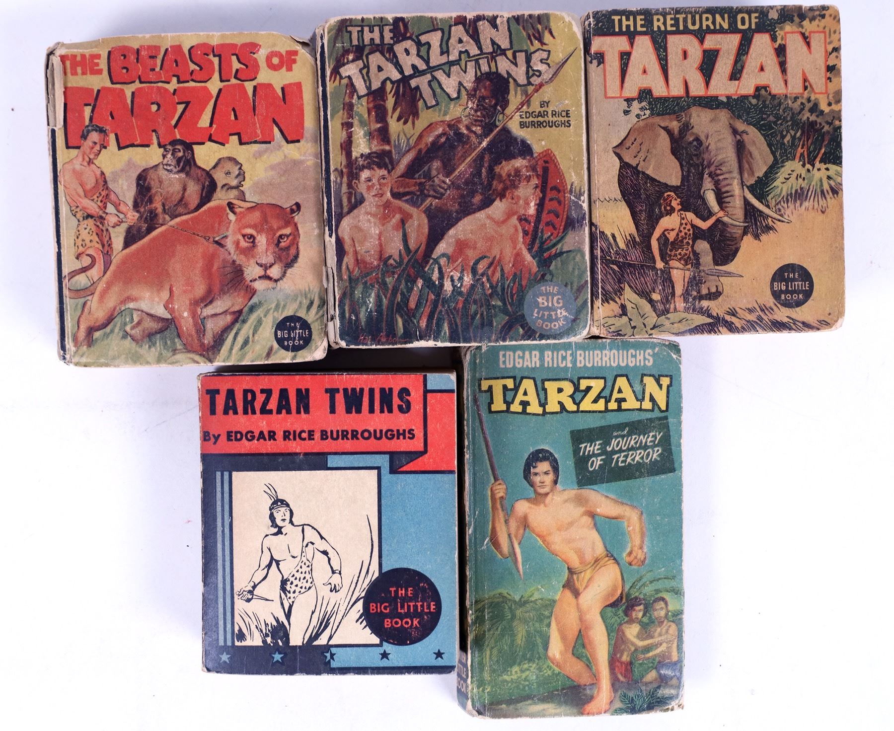 Five Little Big Books featuring Tarzan. 2x The Tarzan Twins, The Return of Tarzan, Tarzan the Journey of Terror, The Beasts of Tarzan. Fair to good condition.