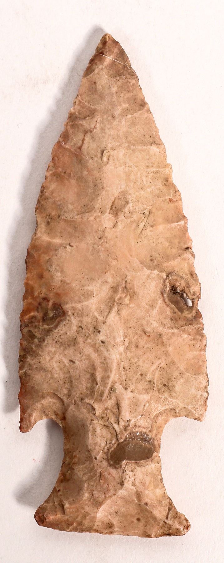 This point is a Big Sandy type with noticeable ears. Almost perfectly symmetrical in shape and knapped thin. It has an interesting air bubble flaw in the stone that was present at the time it was worked and failed to break as it was tooled. A spectacular Big Sandy at 2.75 in./ 70 mm. with spectacular craftsmanship. One of the earliest types from the Indiana area. From the Bracken collection. Please see photos for details.