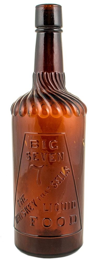 Big Seven 7 Whiskey, "The Whiskey That Sells, Liquid Food". The Rosenblatt Co. / San Francisco Cal. Amber quart, fluted shoulder whiskey bottle, 1908 only. Barnett number 41. Rare, seldom seen, this example is new to the collecting world. Inside screw threads crude glass at the top. Please inspect City: San Francisco State: California Inventory Number: 38171