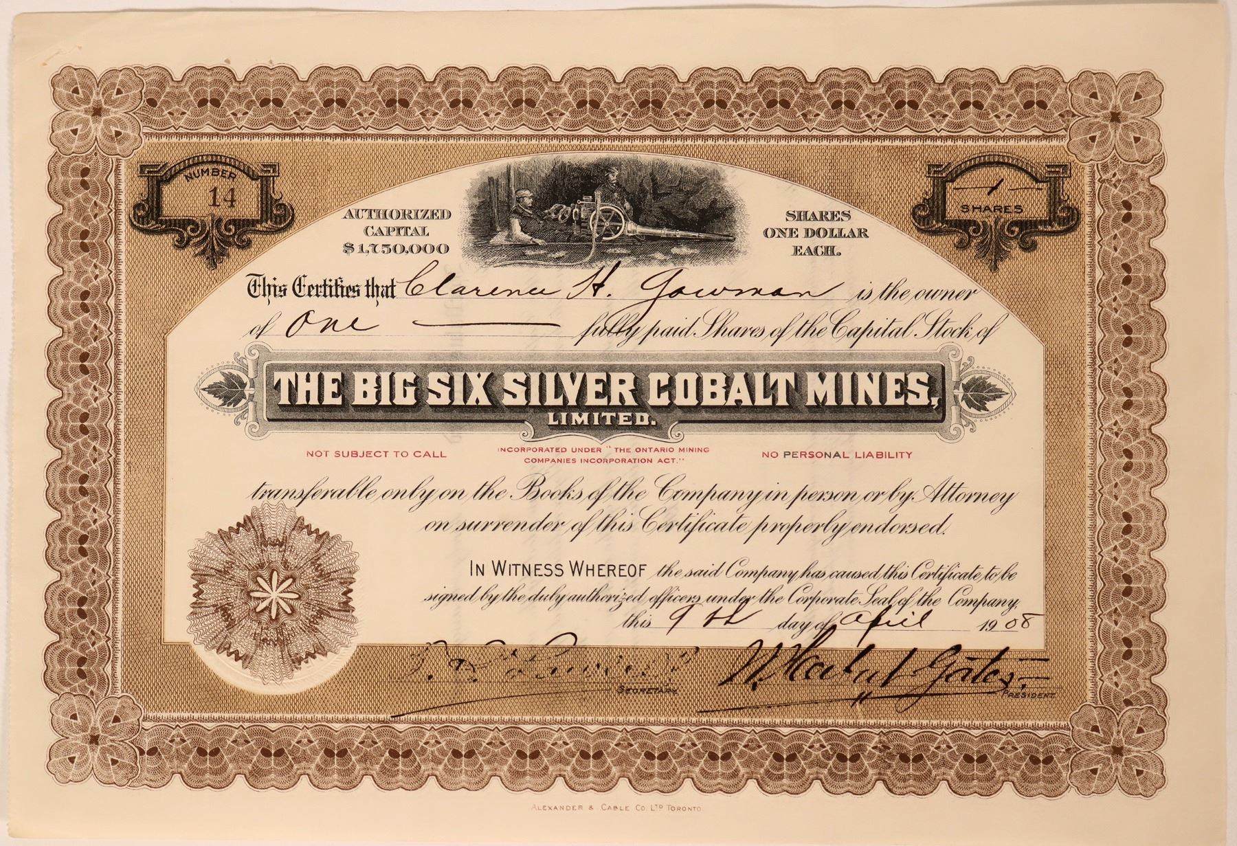 Certificate issued in 1908 for 1 share. Inc. under the Ontario Companies Act. The company operated in the Cobalt district. Hydraulic air compressors were used in the Cobalt district over 100 years ago. Nice looking certificate is in very good, uncancelled condition.