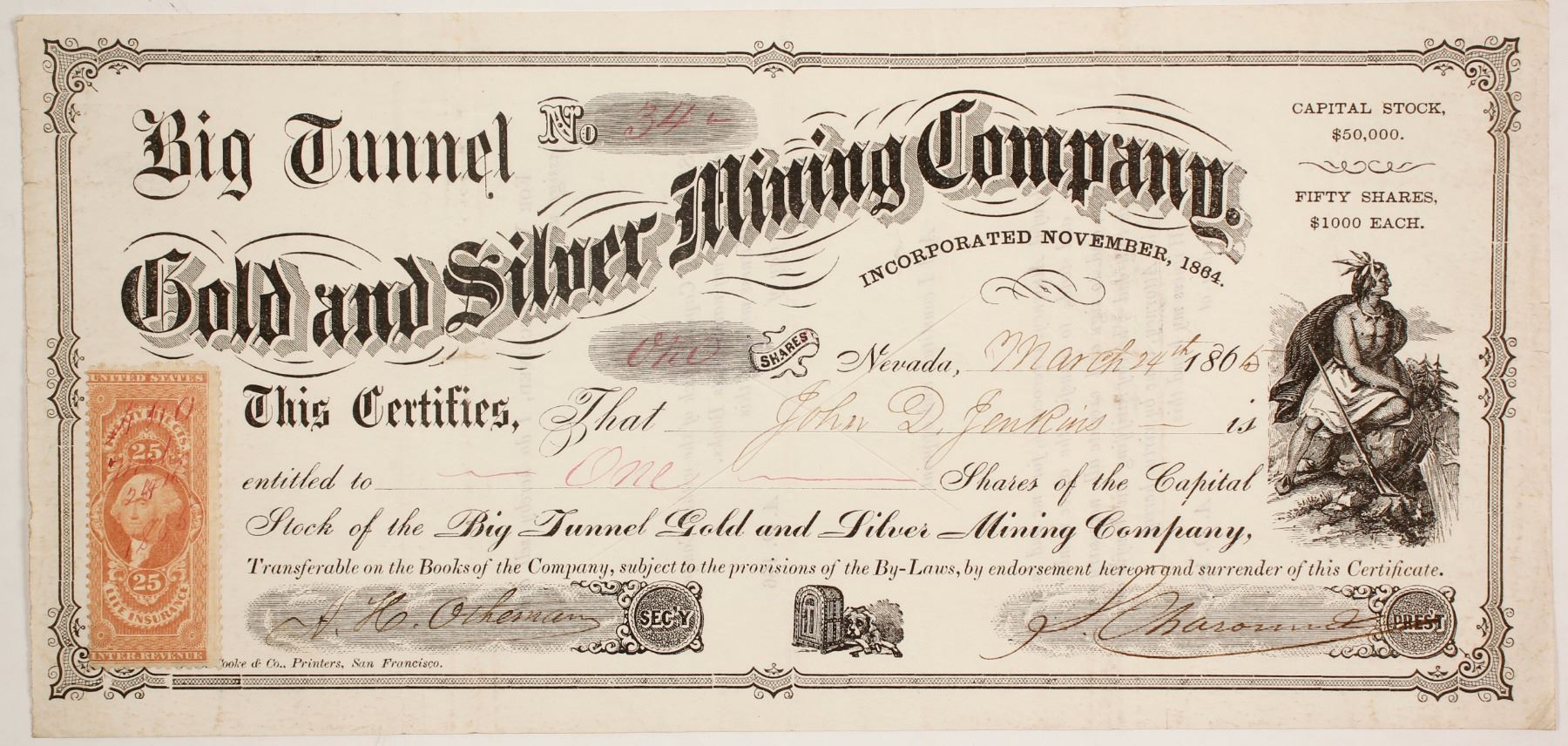 # 34 (early) for 1 share to John D Jenkins. Signed by AH Otherman and president S Charomund. Dateline Nevada [City] 1866. Incorporated November 1864. 25c Life Insurance revenue stamp. Not cancelled. Native American vignette. Cooke & Co. printers of San Francisco. Cut cancelled. Still quite nice! Not listed in Bean's Directory of 1867, California Digital Newspaper Collection or newspapers.com. It is probably a take off of the Gold Tunnel Mining Company. It was a successful venture owned by William Ralston and Lloyd Tevis in 1865. Overman was a professional mining secretary living in Nevada City. Prag Collection State: California City: Nevada City Date: 1866