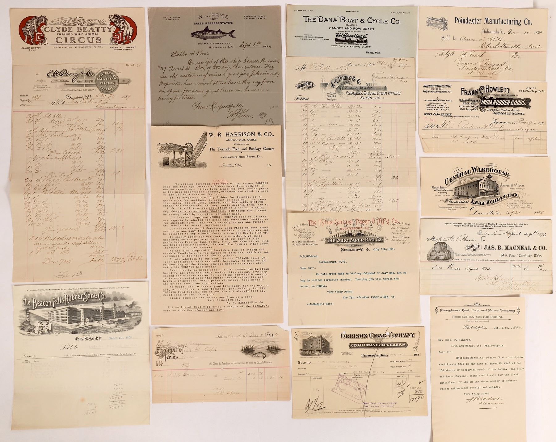Collection of about 20 billheads and letterheads, including one from the Clyde Beatty Trained Wild Animal Circus. The other billheads are from a variety of companies including utility companies, cigar and tobacco companies, various manufacturers, stables, shoemakers, etc. Almost all are pictorial, some with color. They date between the 1870s and 1930s. Good condition.