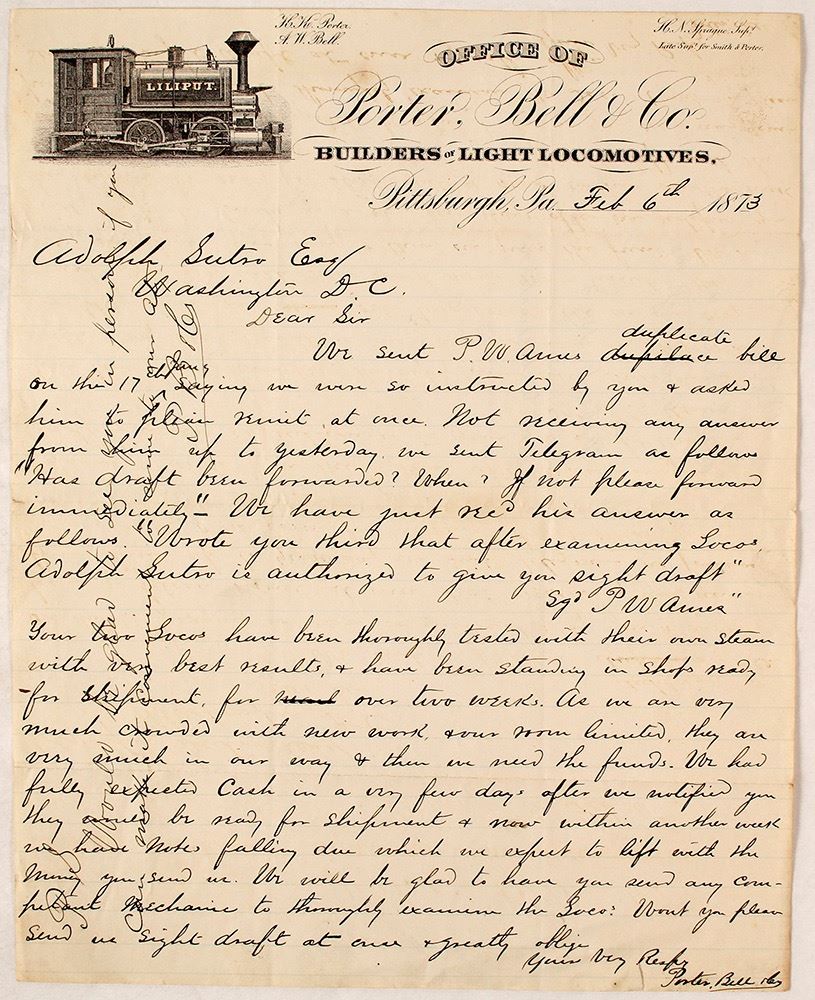 1873 pictorial letterhead from Porter, Bell & Company. Picture of steam engine. Sent to Adolph Sutro in Washington D. C. This would be the time frame where he was trying to get federal funds to build the Sutro Tunnel. Sutro seems to have given the OK to buy two engines (small) from this company. They have thoroughly tested the engines and are ready to ship. Date: 1873 Location: Sutro, Nevada HWAC# 58333