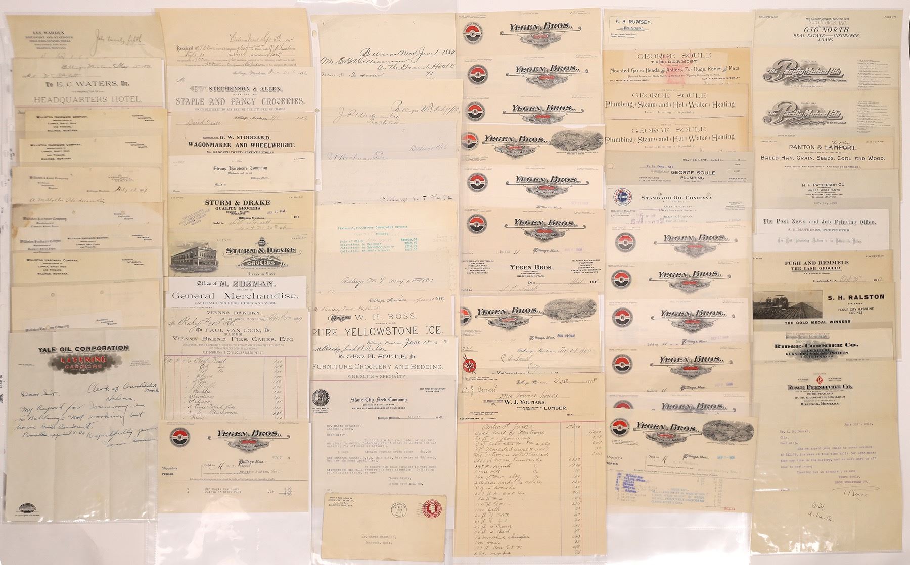Collection of approximately 110 billheads, letterheads and letters from Billings, Montana. Documents include The Grand Hotel (Multiples), The Great Western Sugar Company, Hart Albin Company, Hoskins & Company, Wholesale & Retail Butchers, W.S. Hughes Plumbing and Heating, Northern pacific Railroad Company and many more. Please see photos for more detail and condition.