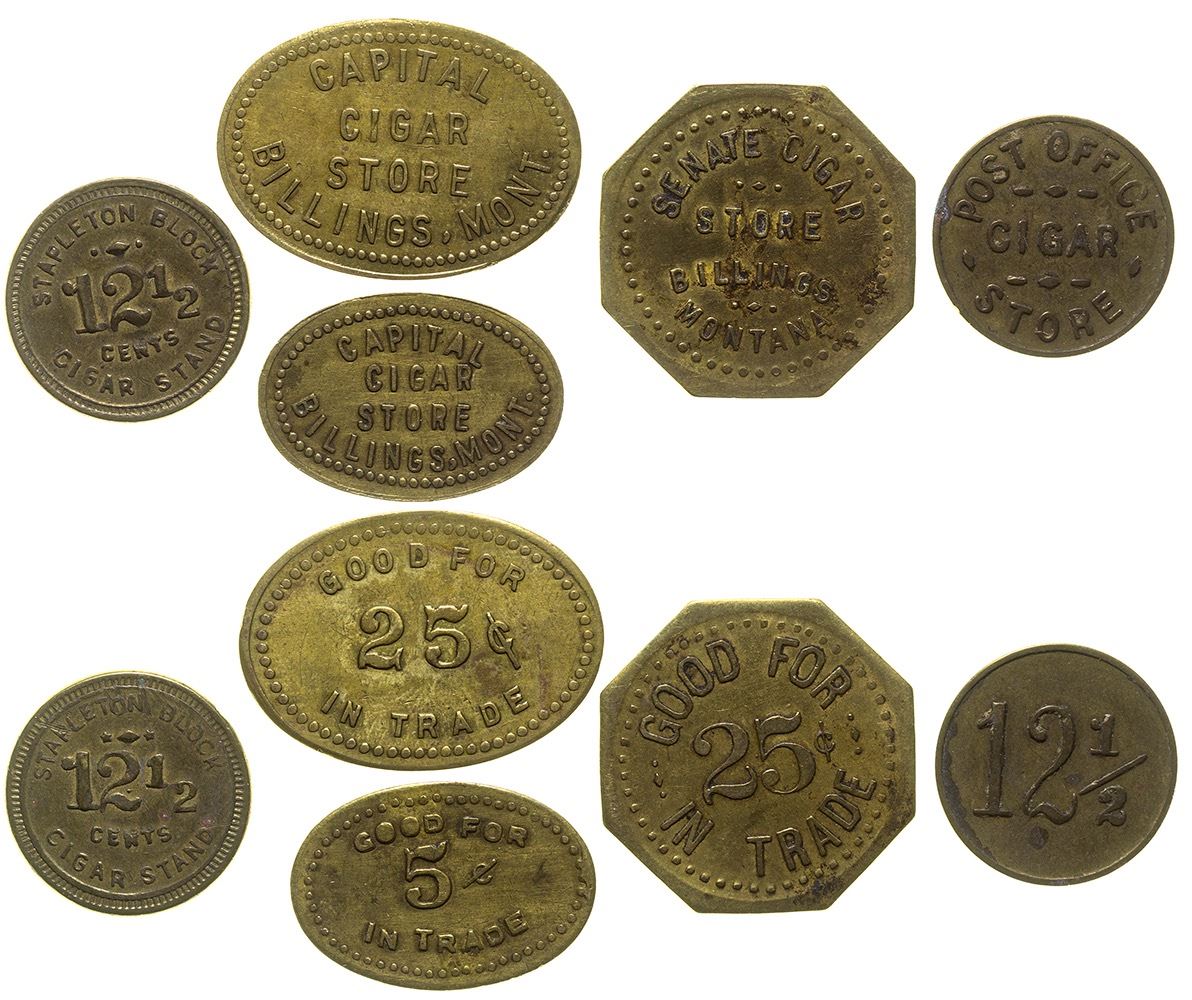 5 Tokens from cigar stores in Billings Montana. Includes 4 R-6's and 1 R-5. R-6 Capital / Cigar / Store / Billings, Mont. // GF / 25c / IT. Oval, Brass, 22mm x 30 mm. R-6 Capitol / Cigar / Store / Billings, Mont. // GF / 5c / IT. Oval, Brass, 25mm x 17mm. R-6 Senate Cigar / Store / Billings, / Montana // GF / 25c / IT. Octagonal, Brass, 27mm. R-6 Post Office / Cigar / Store // 12 1/2. Round, Brass, 20mm. City: Billings State: Montana, Date: Inventory# 39773