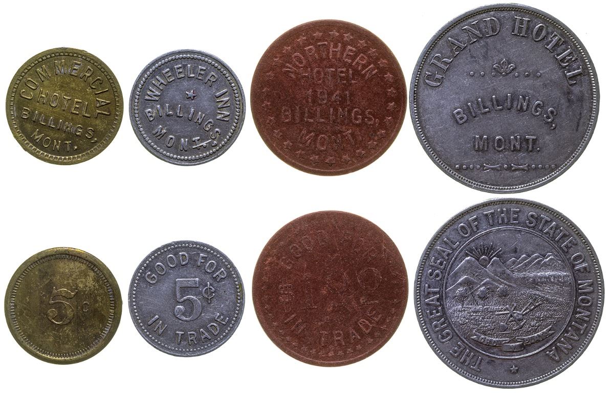 4 Tokens in total from various Billings Hotels. 2 R-6's and 2 R-5's. R-6 Grand Hotel / Billings, / Mont. // The Great Seal Of The State Of Montana. Round, Aluminum, 35mm. R-6 Commercial / Hotel / Billings, / Mont. // 5c. Round, Brass, 21mm. R-5 Northern / Hotel / 1941 / Billings, / Mont. // GF / $1.00 / IT. Round, Red Non-metal, 28mm. R-5 Wheeler Inn / Billings, / Mont. // GF / 5c / IT. City: Billings State: Montana, Date: Inventory# 39778