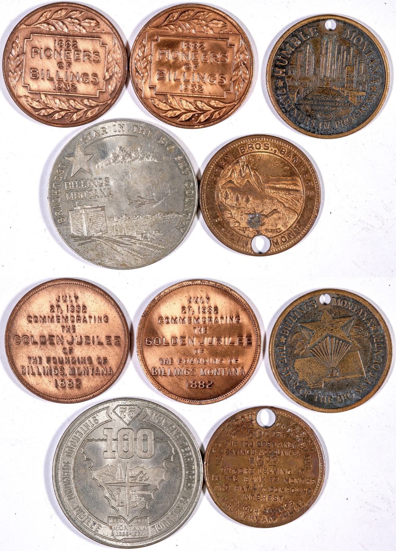 Lot of five medals from Billings: 1) Yegen Bros. Bankers; 2) 1965 Star of the Big Sky Country (holed); 3) 1964 Montana Territorial Centennial; 4 & 5) 1932 Pioneers of Billings.