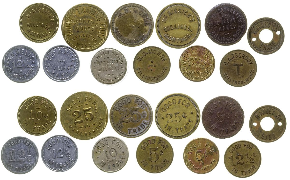 12 Tokens from Billings Montana with names of proprietors on them. Includes 6 R-6's, 2 R-5's, and 4- R-4's. Highlights are an R-6 Frank Savarsey's / Concert / Hall. / Billings, Mont. // GF / 5c / IT. R-6 W. A. Wells / 12 1/2 / Billings, Mont. // GF / 12 1/2 / IT. Round, Aluminum, 21mm. R-6 Young's Trading Post / Sporting / Goods / Billings, / Mont. // GF / 25c / In Merchandise. Round, Brass, 27mm. R-6 Alphonse Hirsch / Dry Goods / and / Millinery / Billings, Mont. // GF /10 / cents / IT. Round, White Metal, 21mm and others. City: Billings State: Montana, Date: Inventory# 40102