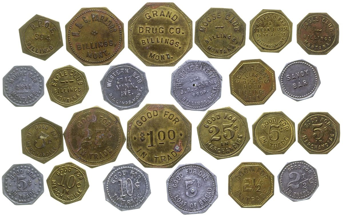 12 Octagonal tokens from Billings Montana that include 2 R-6's, 6 R-5's, and 4 R-4's. The Highlights are an R-6 Geo Green's / Billiard / Room / Billings, / Mont. // GF / 2 1/2c / IT. Octagonal, Brass, 22mm. R-6 N. & C. Parlors / Billings, / Mont. // GF / 25c / IT. Octagonal, Brass, 29mm. R-5 Eagle Club / Billings / Montana // GF / 10c / In Merchandise. Octagonal, Brass, 19mm and others. City: Billings State: Montana, Date: Inventory# 40105