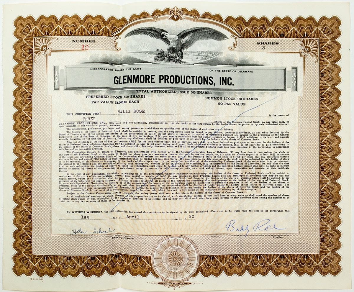 Three shares of stock in Glenmore Productions issued and signed by President Billy Rose in April 1950. Billy Rose was personal secretary to Bernard Baruch early in his career and went on to become a lyricist and Broadway Promoter into the 1960s. Among his hit lyrics are "Me and My Shadow," "Does the Spearmint Lose its Flavor on the Bedpost Overnight," "I Found a Million Dollar Baby" and "It's Only a Paper Moon." Prag Collection.