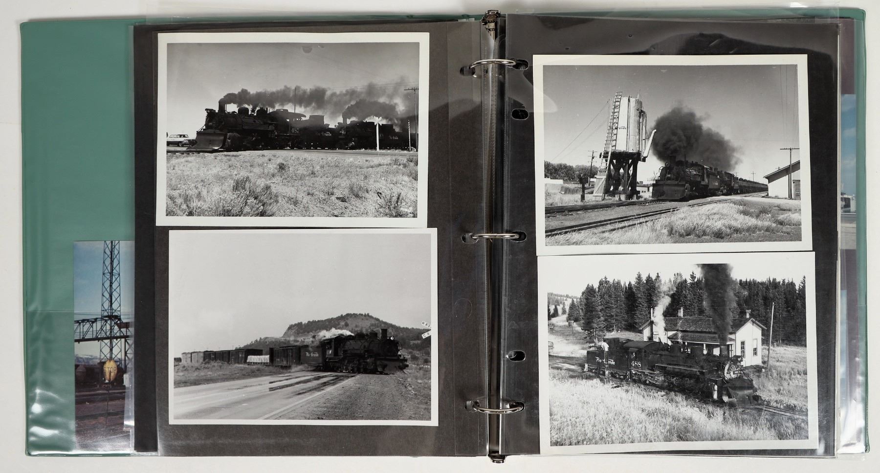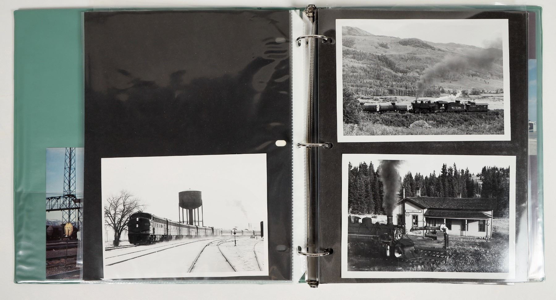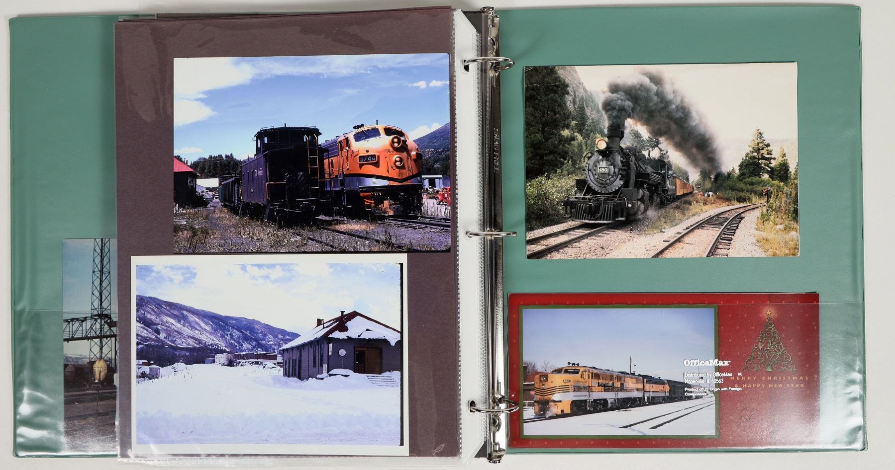 This lot is a binder of Rio Grande Train photos featuring the Rio Grande Train travelling the Denver & Rio Grande Western Railroad through mountains and train stations. This binder also contains photos of trains that have crashed or fallen off the tracks. Some photos are in black and white, and others are in color.