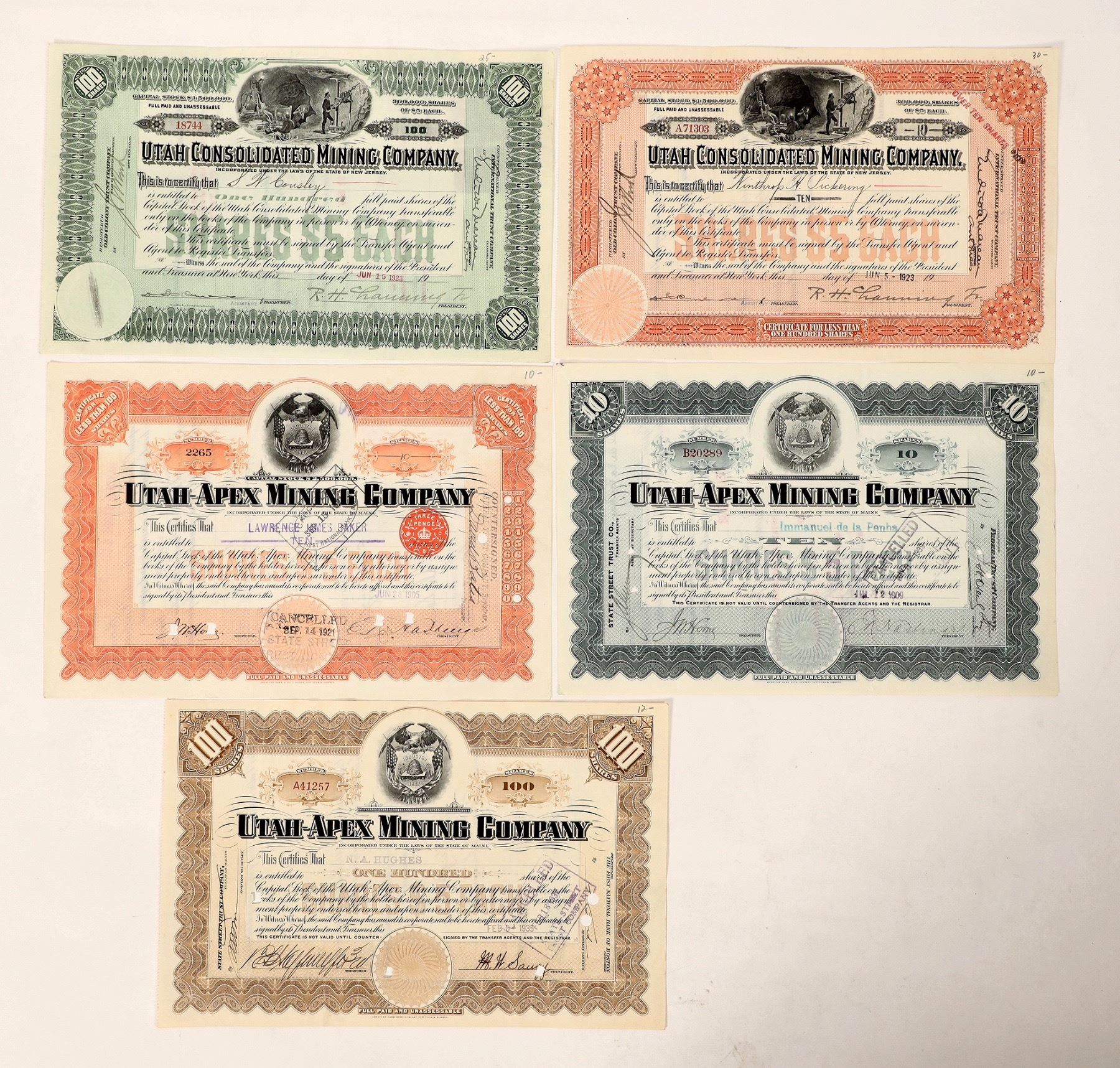 All issued. 1909, 1905, 1935-staple holes Utah-Apex Mining. 2 different 1923 Utah Cons. Mining-green has staple holes.[ Bingham Utah