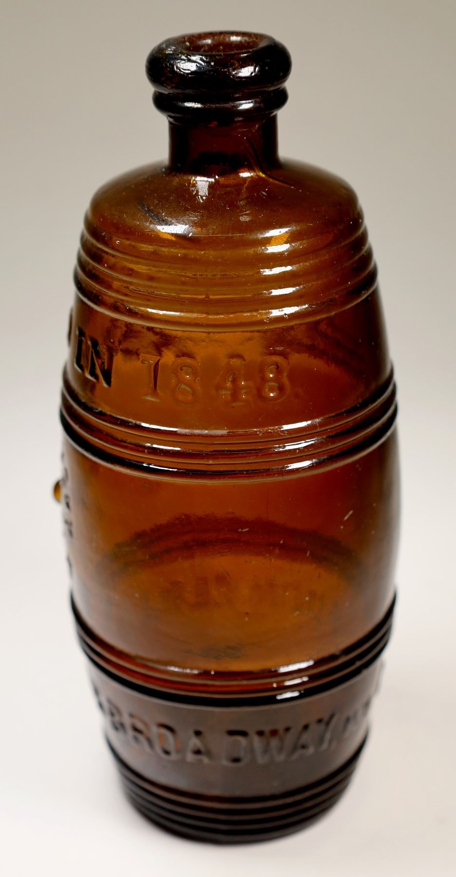 "Distilled in 1848. / Old Kentucky / 1849 / Reserve / Bourbon / A. M. Binninger & Co. 338 Broadway, NY" Amber. Open Pontil. Minor surface wear. Double ring collar. Classic figural whiskey bottle.