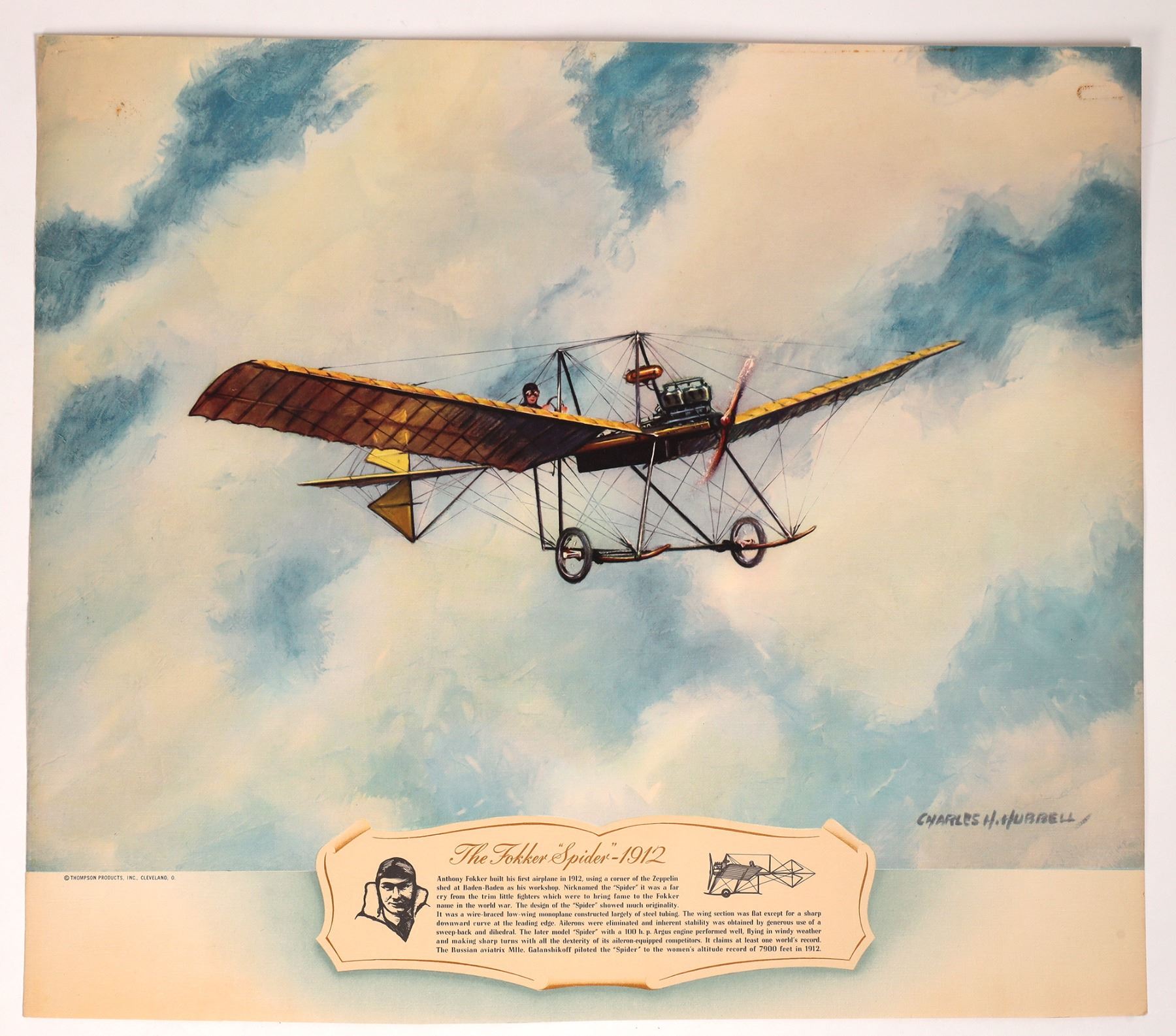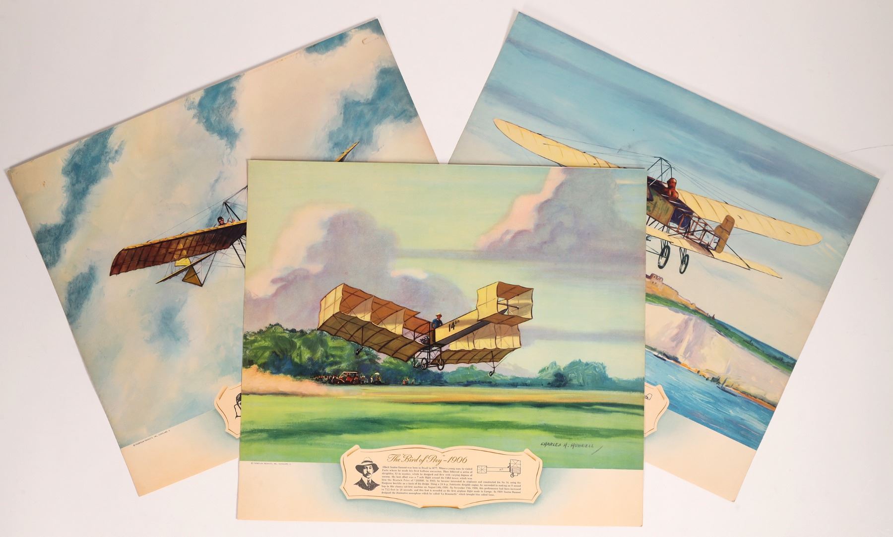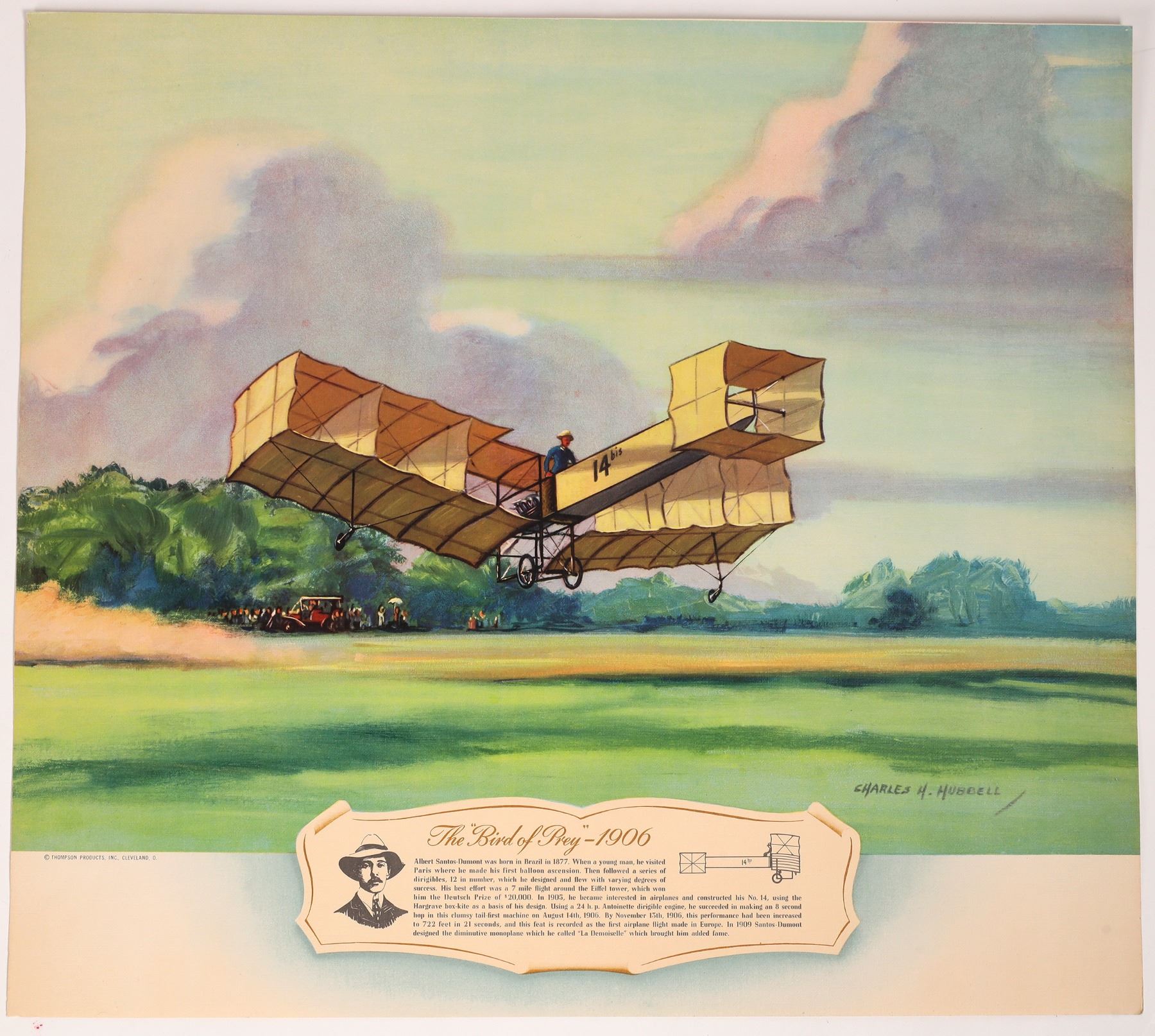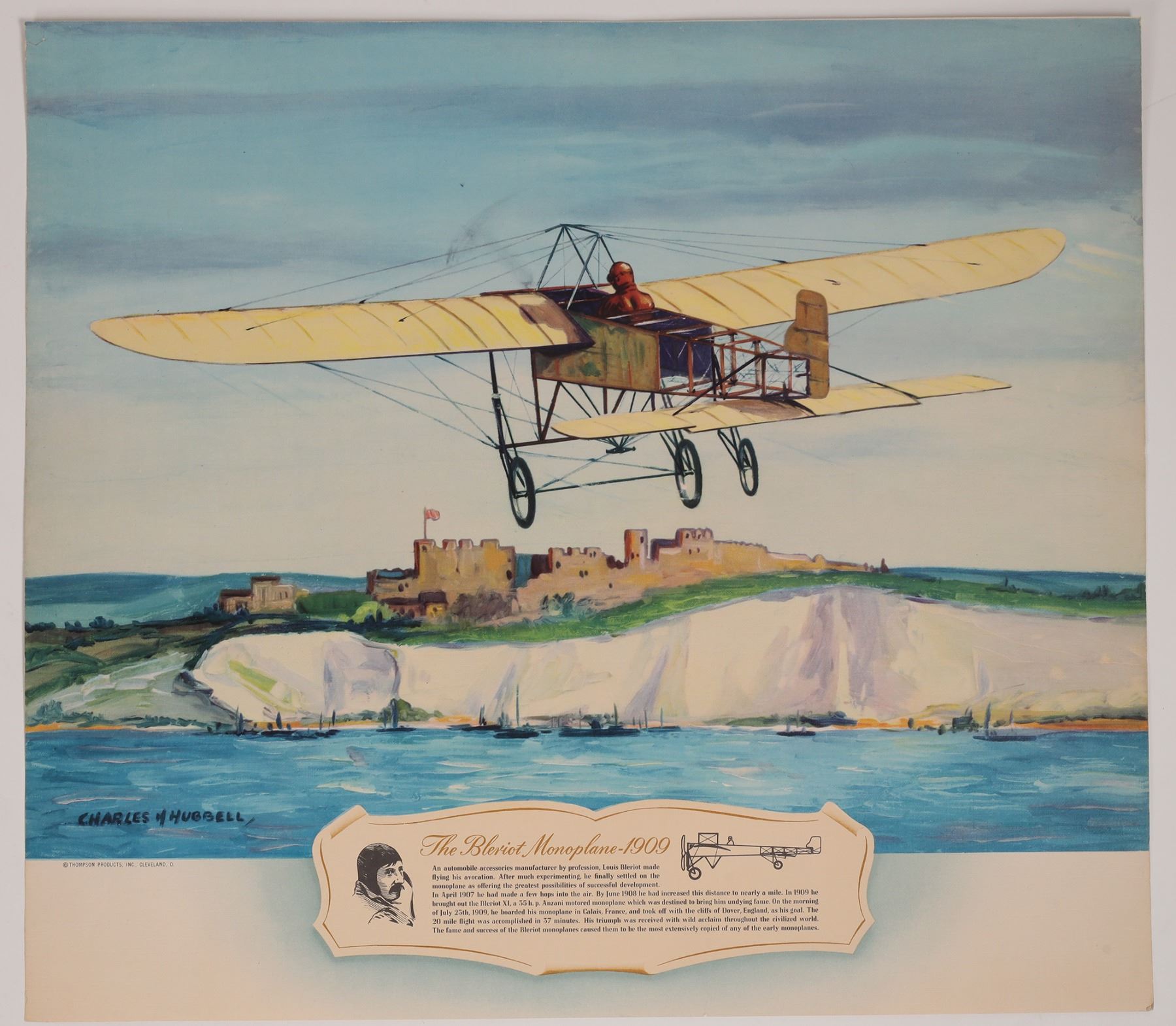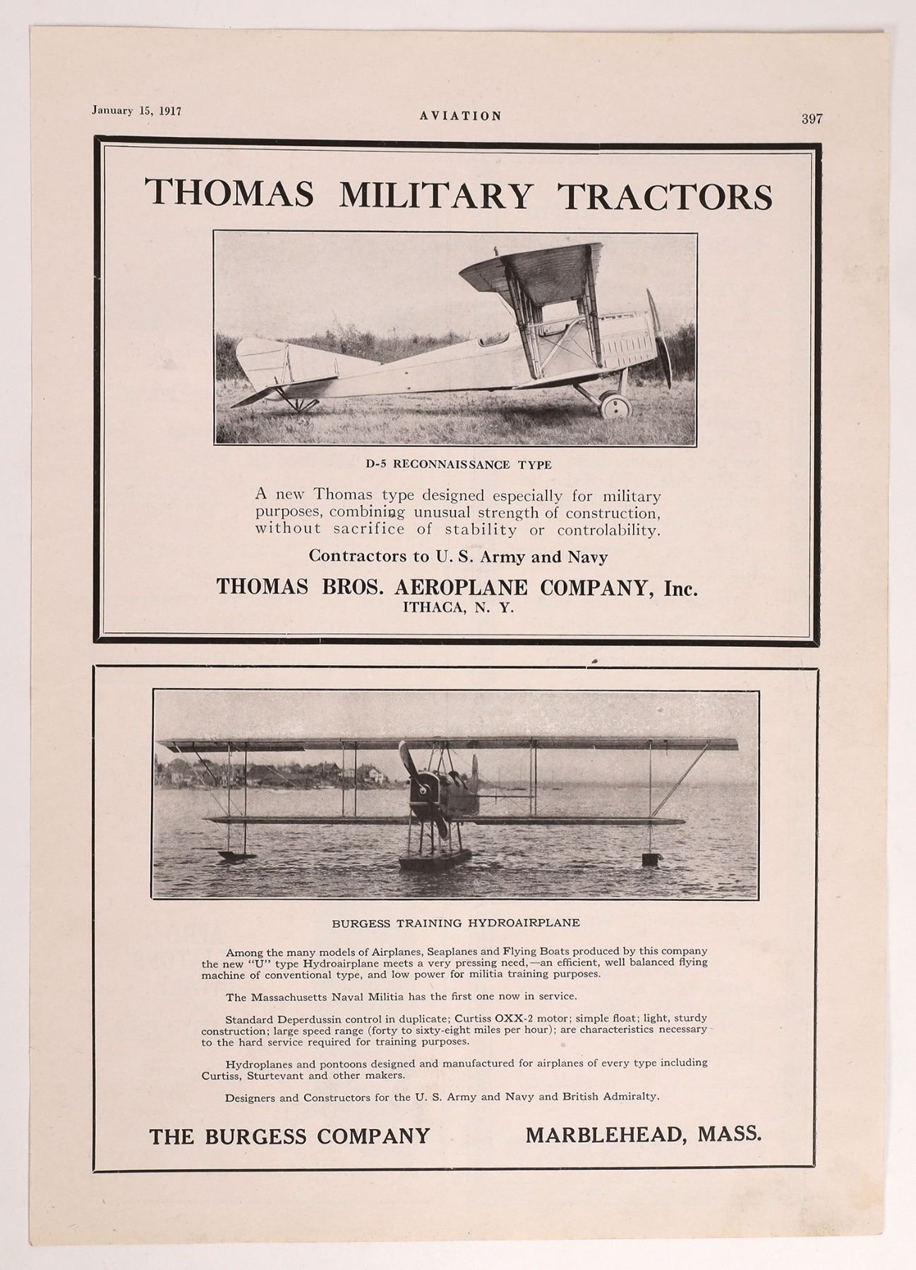 1909 Bleriot monoplane by Hubbell, 14x16". 1917 Aviation magazine Tomas Bros. and Burgess biplane ads on single page. 12x8".
