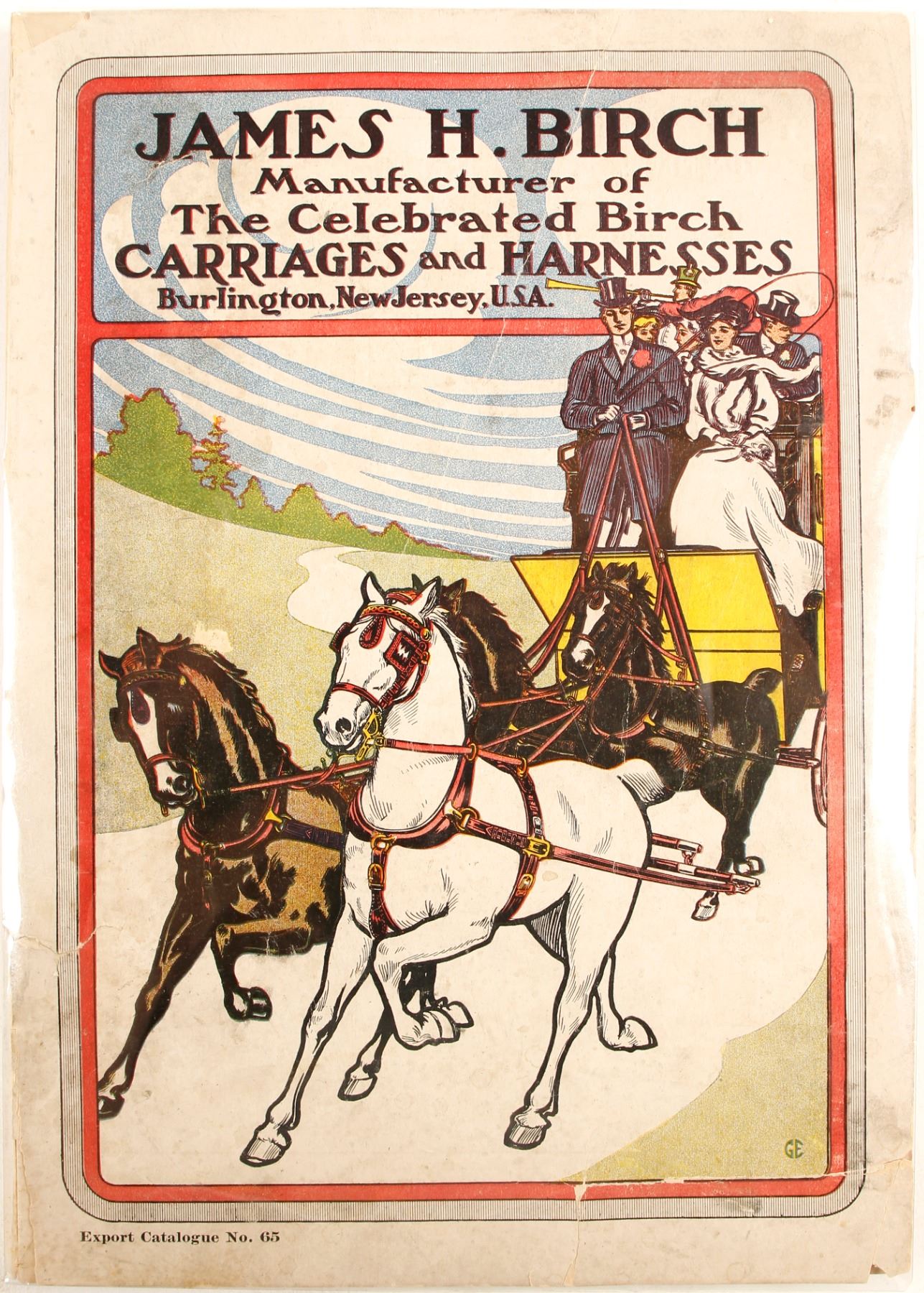 Pictorial 1902 catalog from James H. Birch of Burlington, NJ featuring Birch carriages and harnesses. Export catalog No. 65, 208pp. Both covers have some tape repairs and small chips.