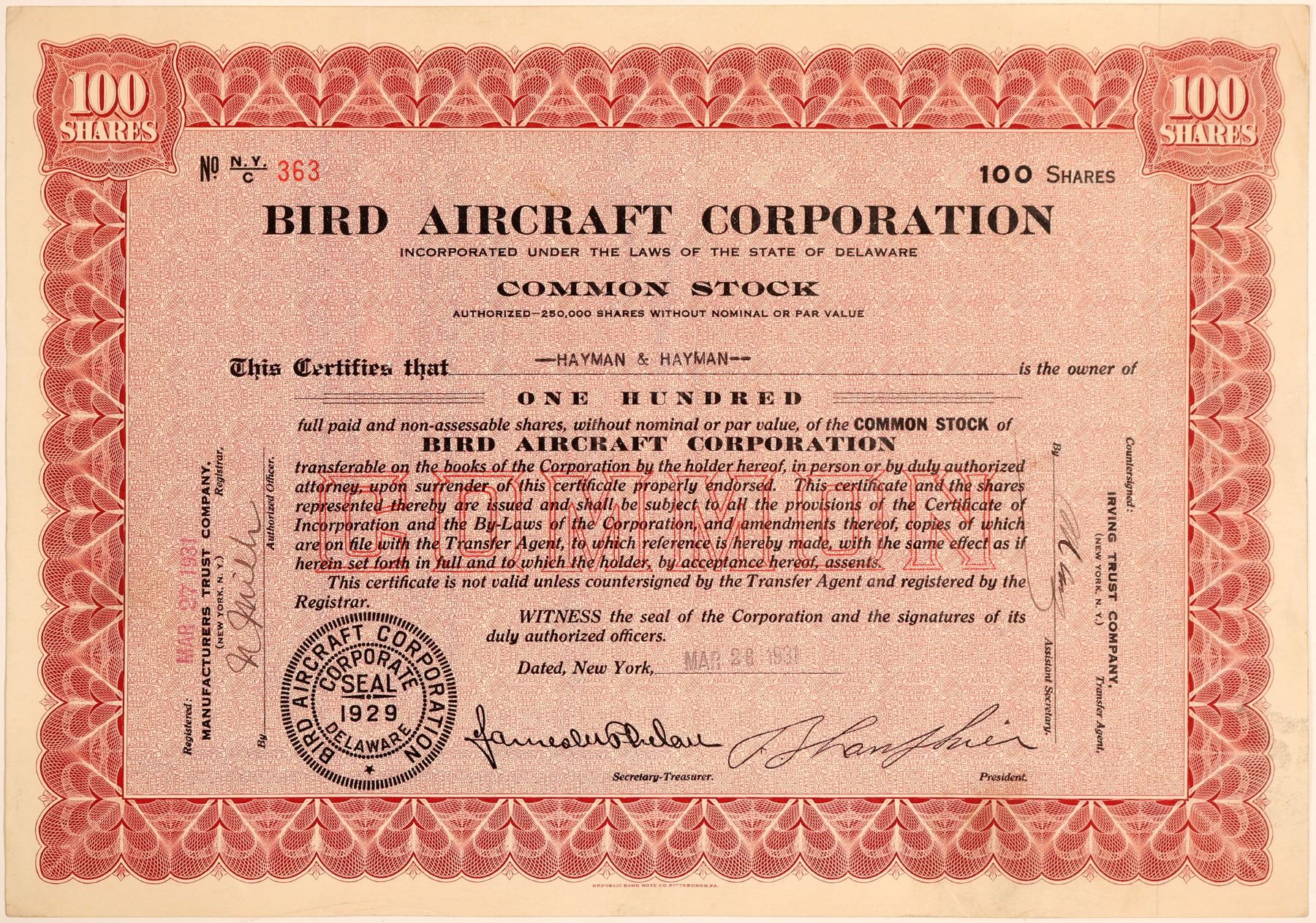 Inc. in Delaware, 1929. No. 363, issued for 100 shares to Hayman & Hayman on Mar. 26, 1931. Printed signatures of the president and secretary. Not cancelled. Red border and background, black print. Pinholes, folds, small stains. Printed by Republic Bank Note Co., Phila. 8 x 11" The Brunner-Winkle Aircraft Co, established in New York in 1928, was renamed Bird Aircraft Corp in 1930. In 1933 all rights were sold to Perth Amboy Title Co and no further aircraft were produced. [Ref:https://airandspace.si.edu/collection-objects/bird-aircraft-co-san-diego-ca] Ken Prag Collection