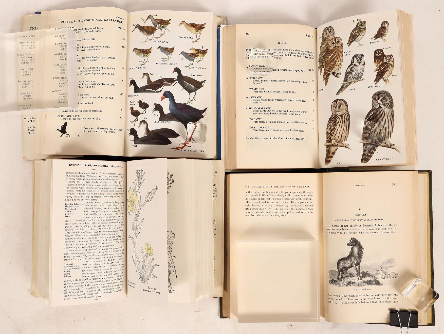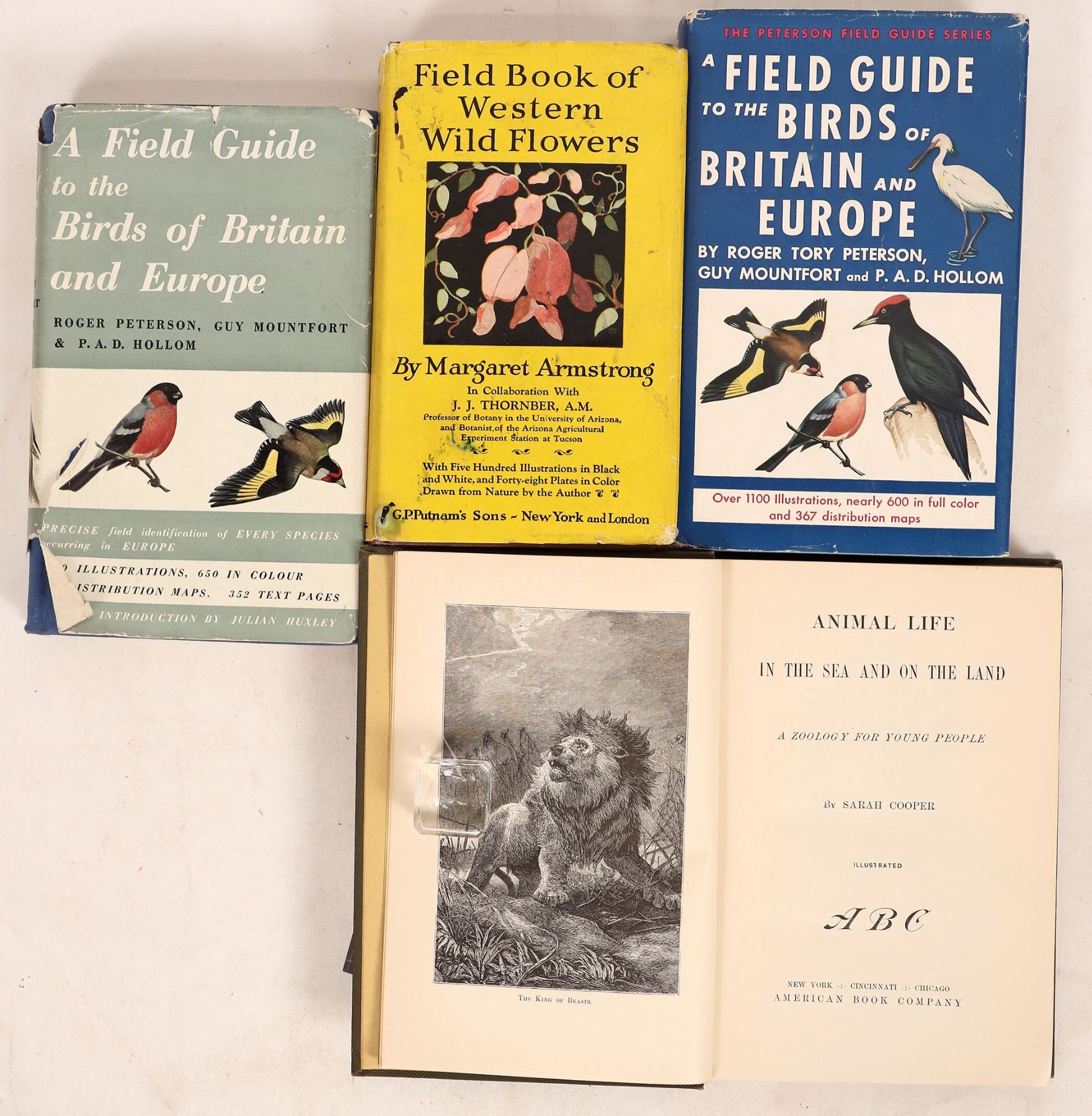 (4) Field Guides: Two Editions of "A Field Guide to the Birds of Britain and Europe" Peterson Mountfort Hollom. "Animal Life in the Sea and on the Land" by Sarah Cooper. "Field Book of Western Wild Flowers" by Armstrong.