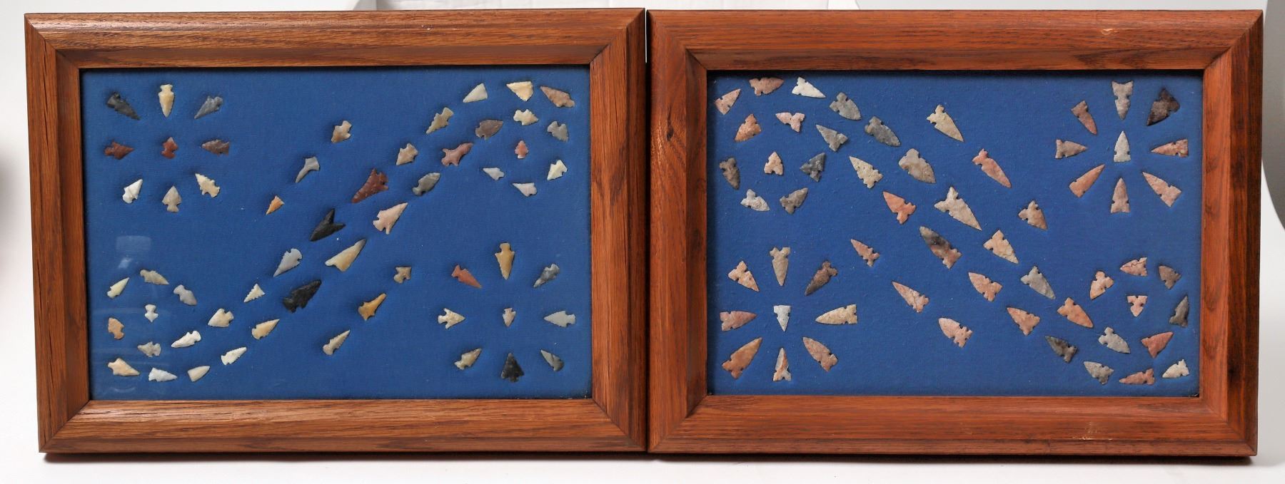 This is a collection of bird points from Oklahoma and Arkansas; over 110 points in all. The first display case from Oklahoma has side notches, three have double-side notches, possibly made from the same hand. The second display case from Arkansas show a different technique of pressure flaking with several serrated points. Sizes vary from.5 in. / 14 mm to 1.5 in./ 38 mm. Both display cases are 17 in. X 12 in. Please see photos for details. From the Bracken Collection. State: Oklahoma, Provenance: Gary Bracken Collection