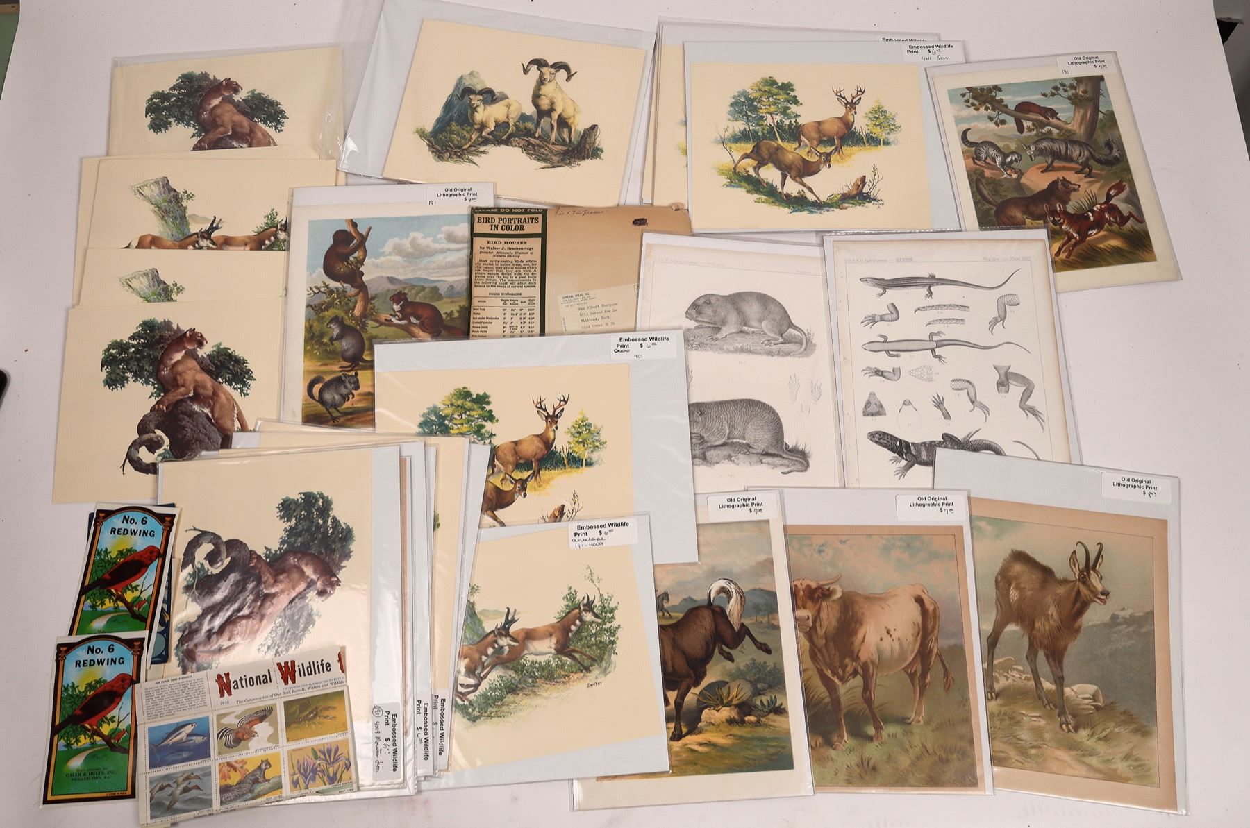 About 60 nice embossed cougar and big horn sheep prints by Sweney, 8x10". About 50 assorted prints-birds, deer and more. State: City: Date: Provenance: