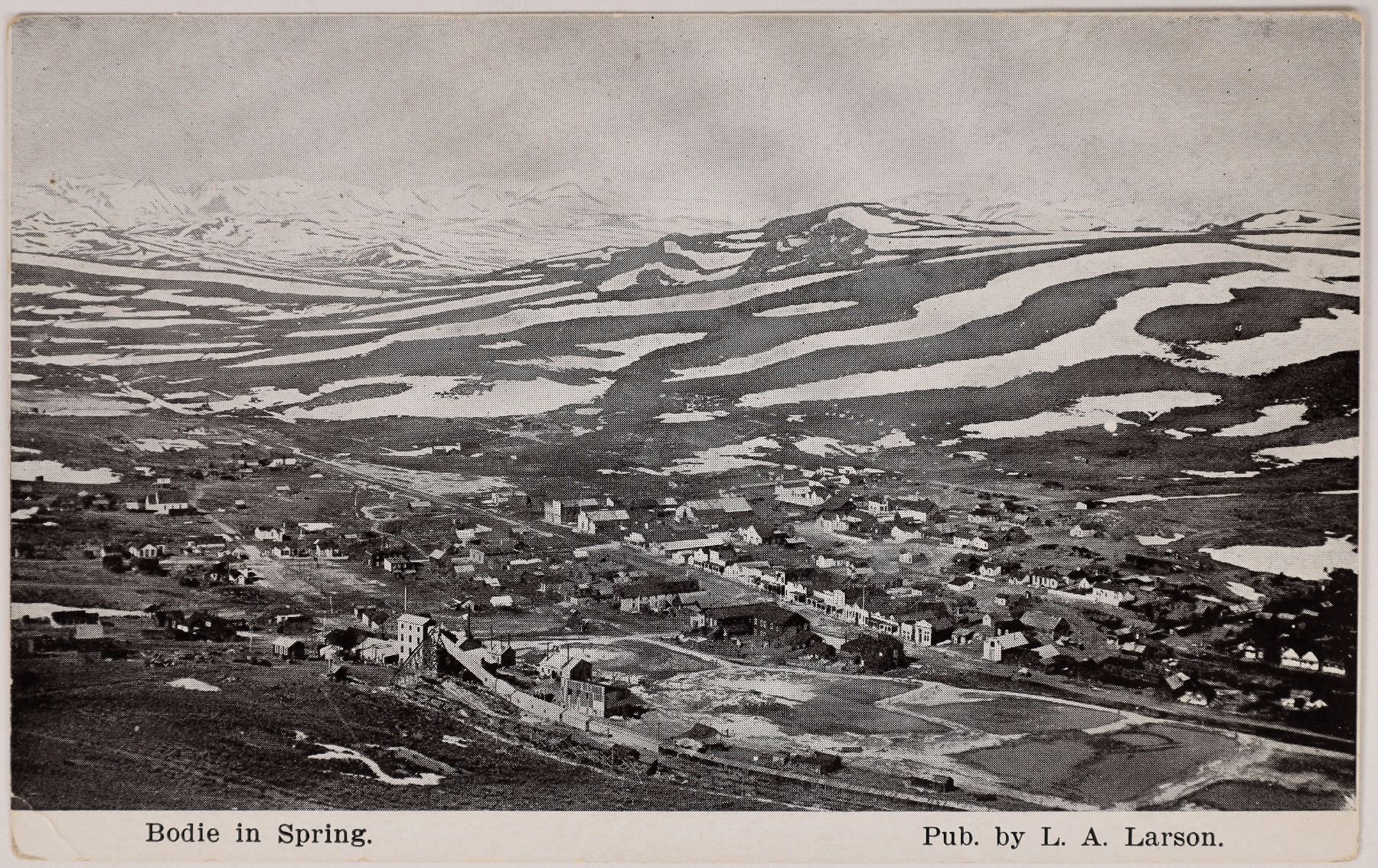 Great printed photo postcard showing the whole town post- mining boom but before the devastating fire of 1932 and the transition to a ghost town and then state park. "Bodie in Spring," "Pub. by L.A. Larson." Taken from the hill above Bodie. Postally unused. Some wear on reverse.